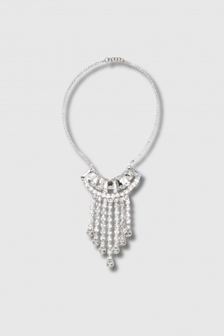 This Dries Van Noten necklace embodies a bold, expressive approach to jewelry, combining light and movement. A fine chain supports a structured crystal-embellished panel, extended by cascading strands that catch the light with every movement.