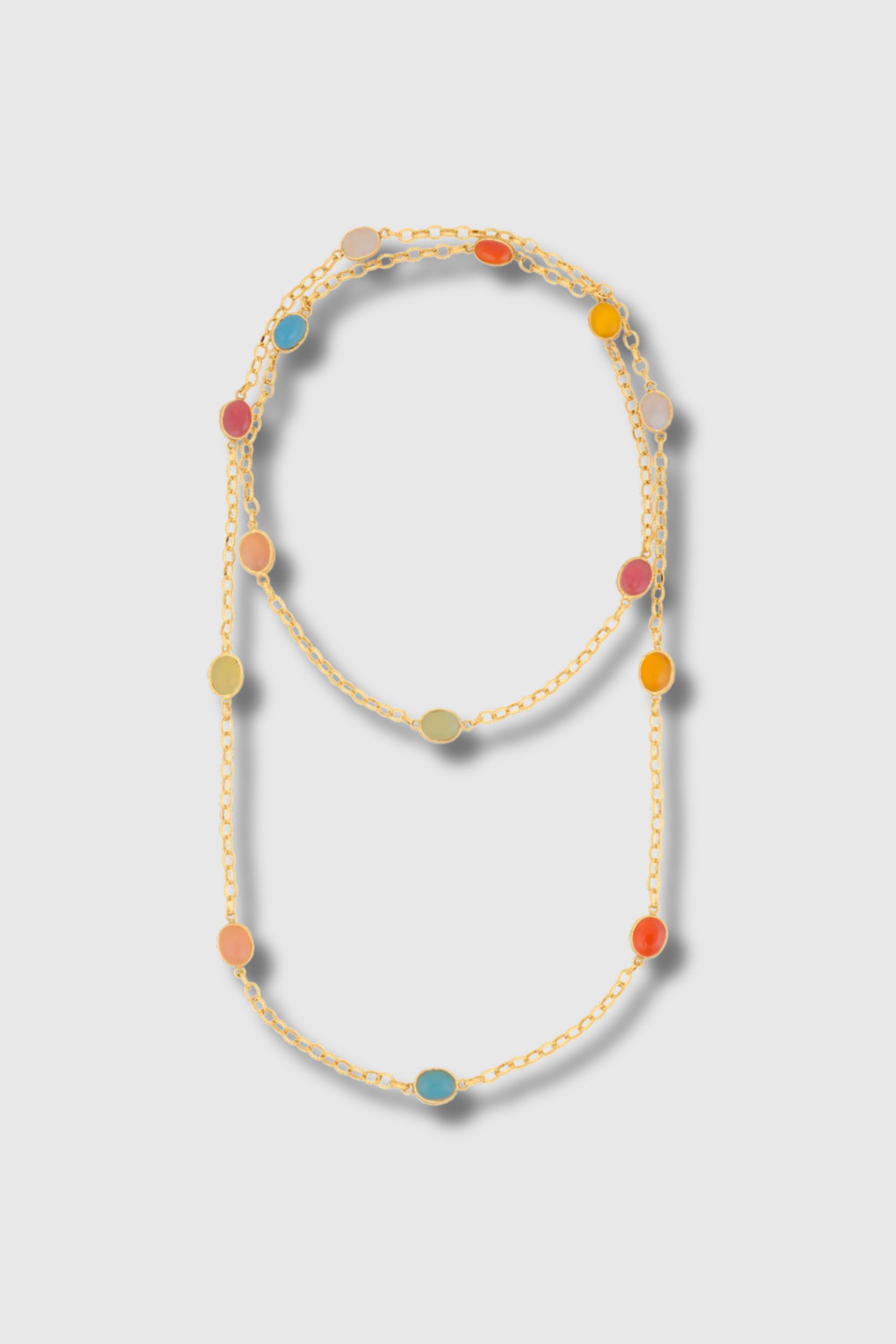 Each stone is unique in its shade and variations, creating a harmonious play of colours reminiscent of summer energy. The delicate structure adds movement and beautifully catches the light, enhancing the neckline with elegance.