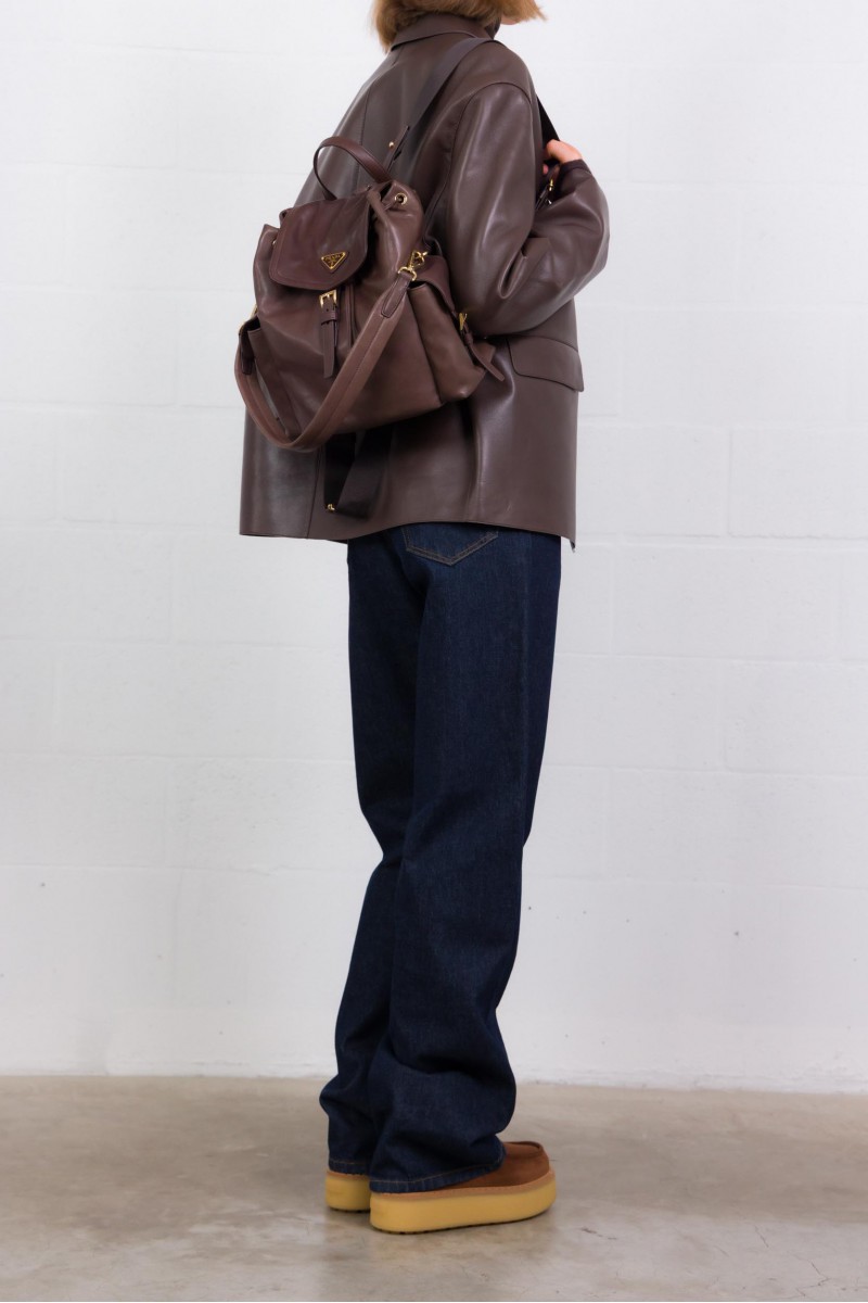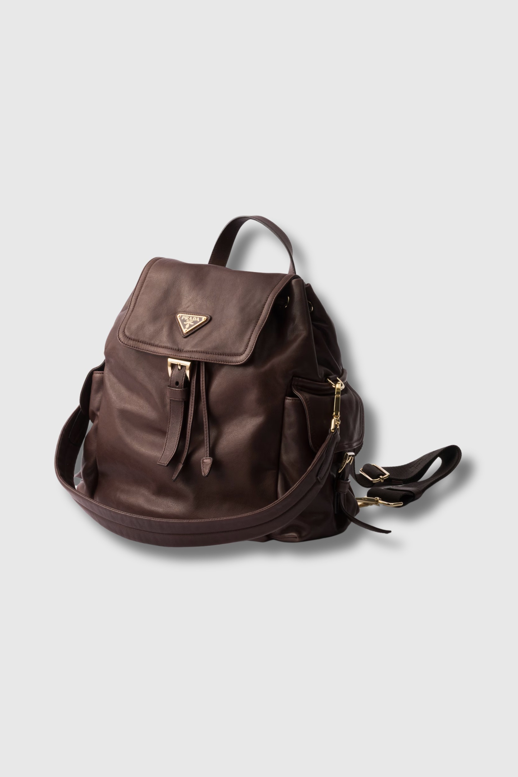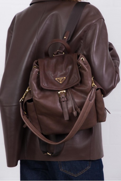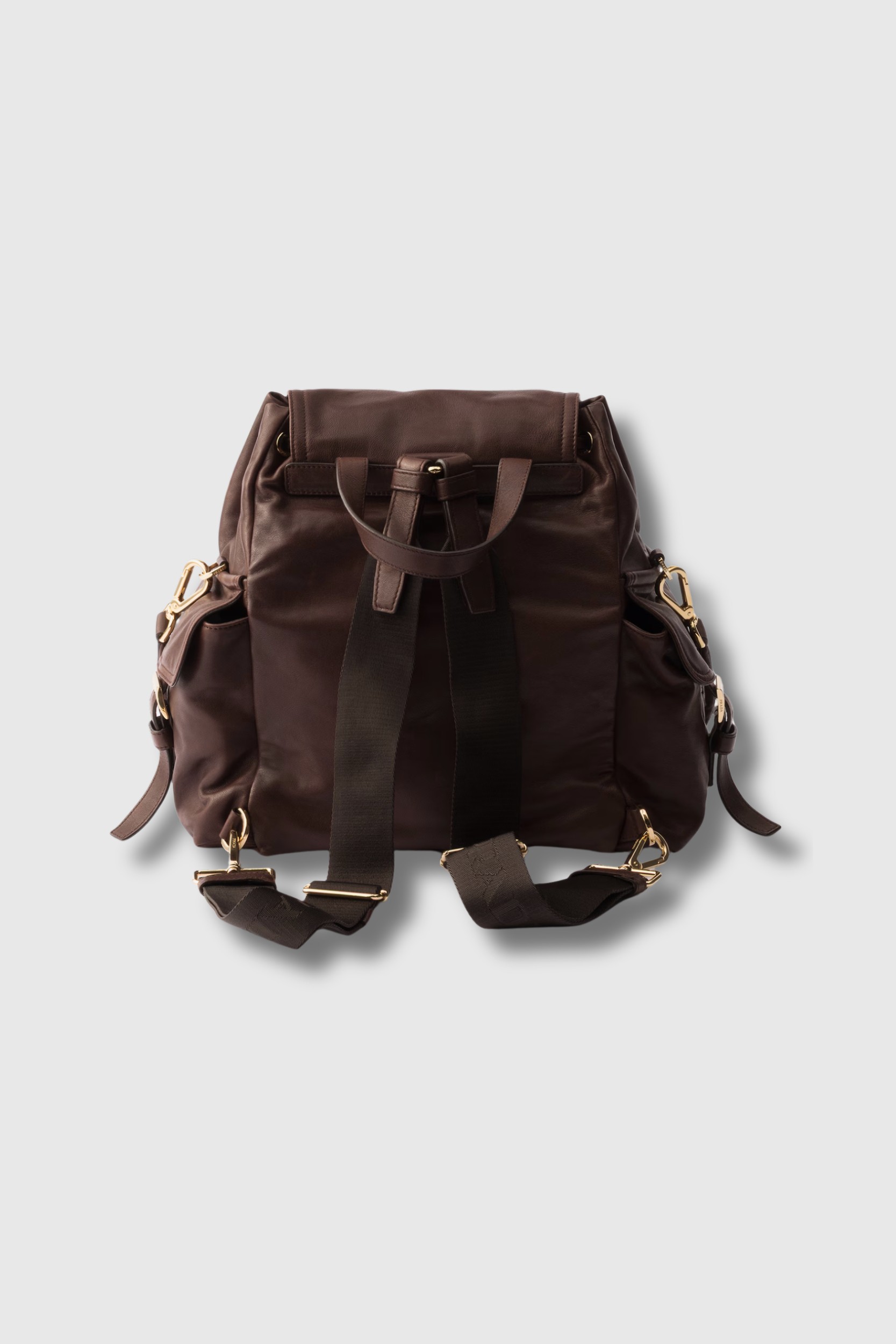 The brown Prada Explore backpack merges utility with refined style. Crafted from smooth Nappa leather, this medium-sized model presents a structured and sleek silhouette. It features multiple exterior zip pockets, a roomy main compartment with zip closure, and an internal organizer. Adjustable shoulder straps, a padded back panel, and a top handle ensure versatile wear. Palladium-finish metal hardware accentuates its subtle sophistication.