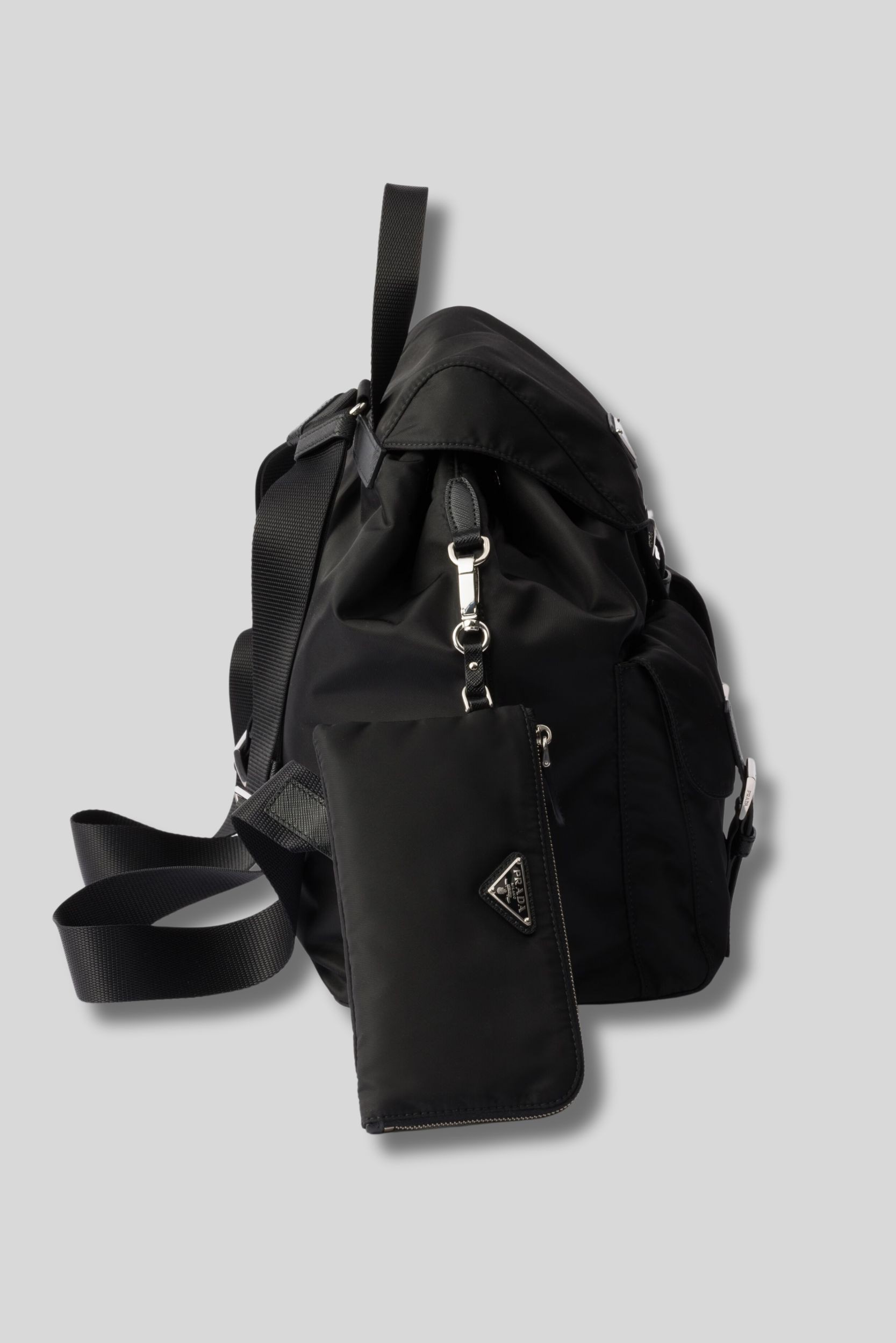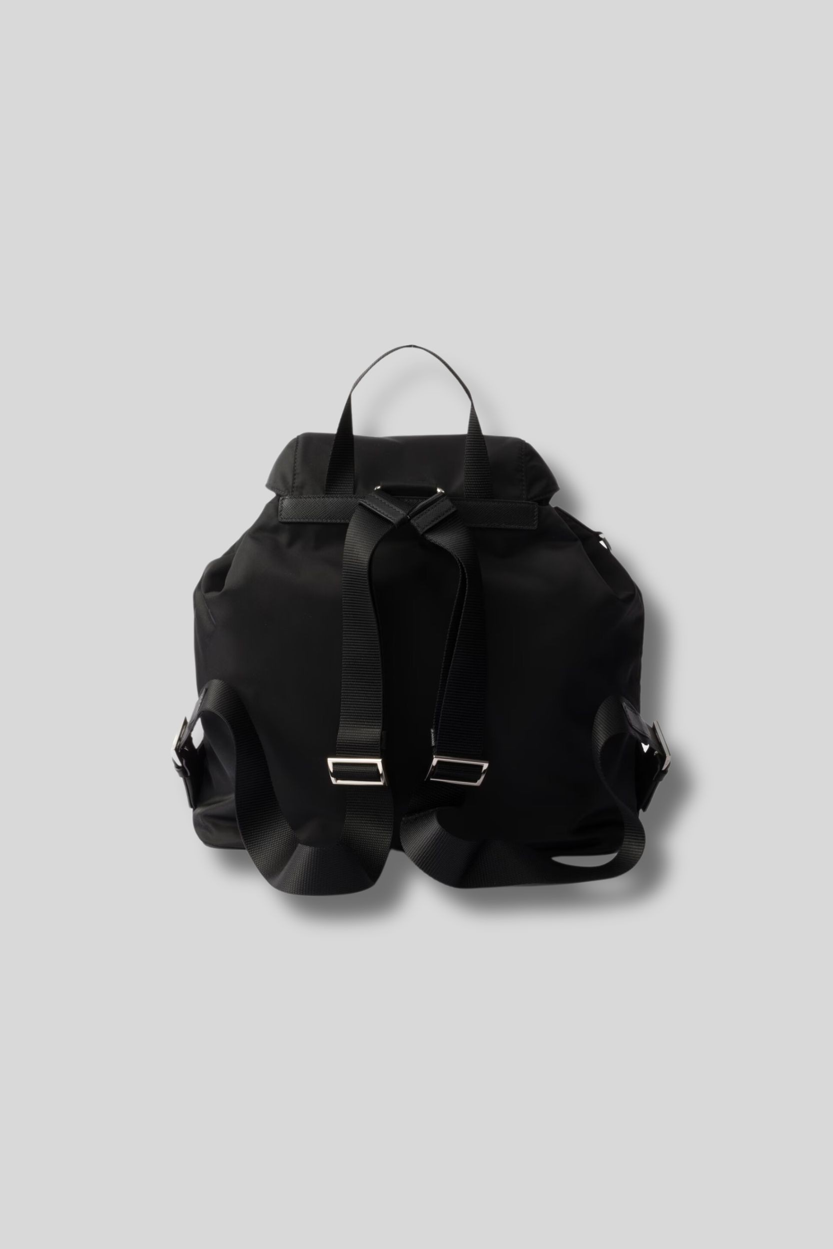 This iconic black Re-Nylon backpack is designed by Prada. Combining modern style with timeless elegance, it features a Re-Nylon base—a durable version of Prada's signature industrial fabric—paired with Saffiano leather details. The front is adorned with the enameled metal triangle logo, a historic emblem reimagined each season in a contemporary style.