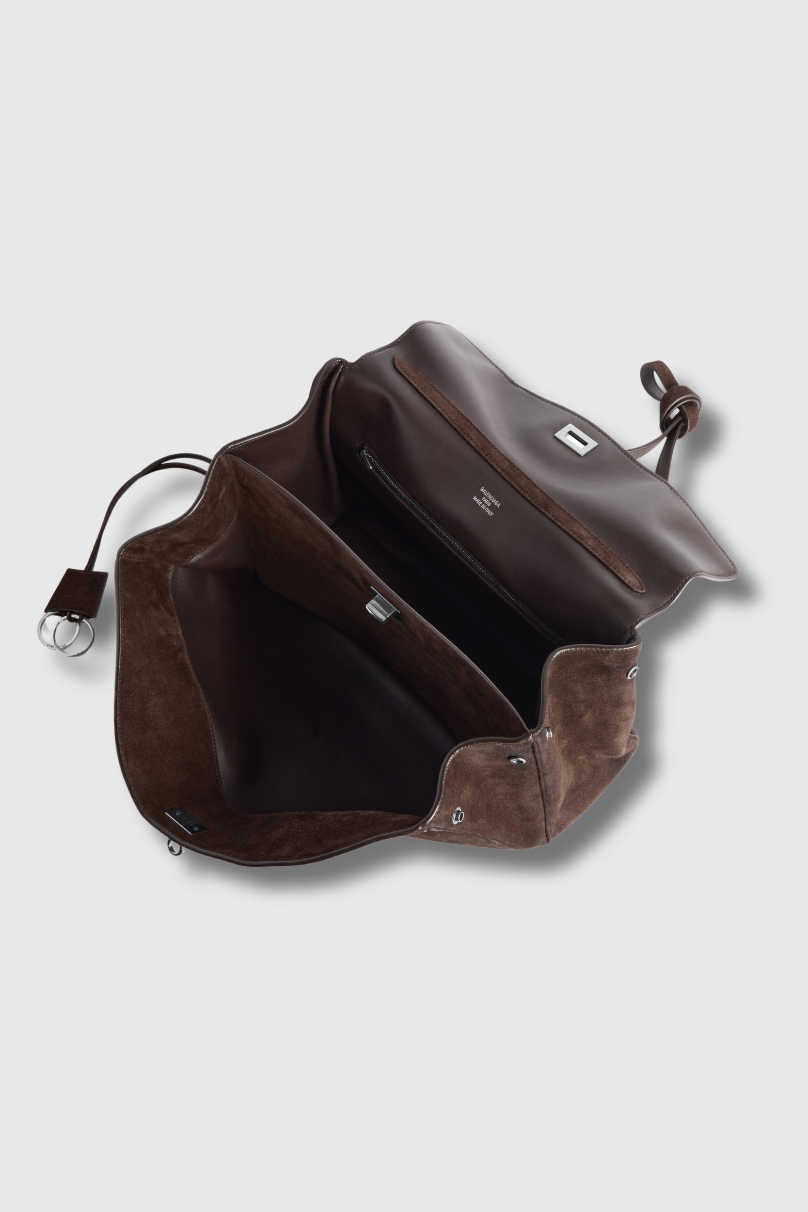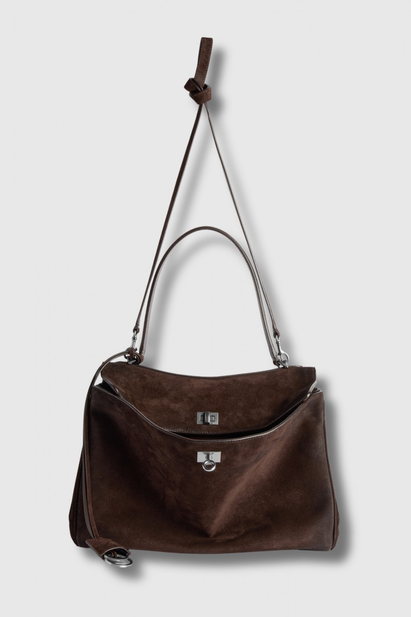 The medium Rodeo bag from Balenciaga epitomises understated luxury. Crafted from high-quality smooth calf leather, it features a refined, softly structured silhouette with a top handle and a removable shoulder strap – offering versatile wear as a handheld or shoulder bag. Its practical dimensions combine elegance and utility: a generous main compartment, an interior zip pocket, two flat back pockets and a roomy front pocket allow for intelligent organisation. The turn-lock closure, aged silver hardware, removable leather keyring and protective brass feet underscore its sophisticated craftsmanship. A must-have for those seeking elegance, versatility and modern luxury in a designer handbag.