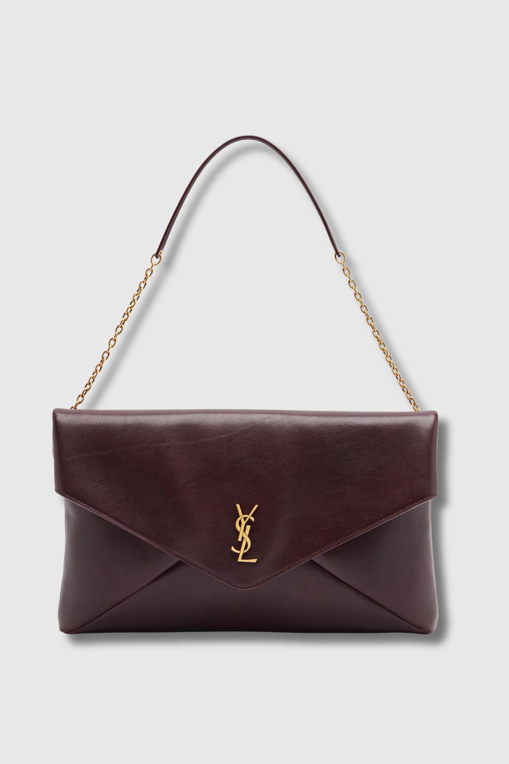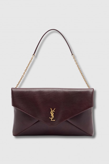 The Cassandre Envelope bag by Saint Laurent embodies timeless elegance with a bold yet refined attitude. Crafted from smooth bordeaux leather, it stands out for its supple texture and sophisticated finish.