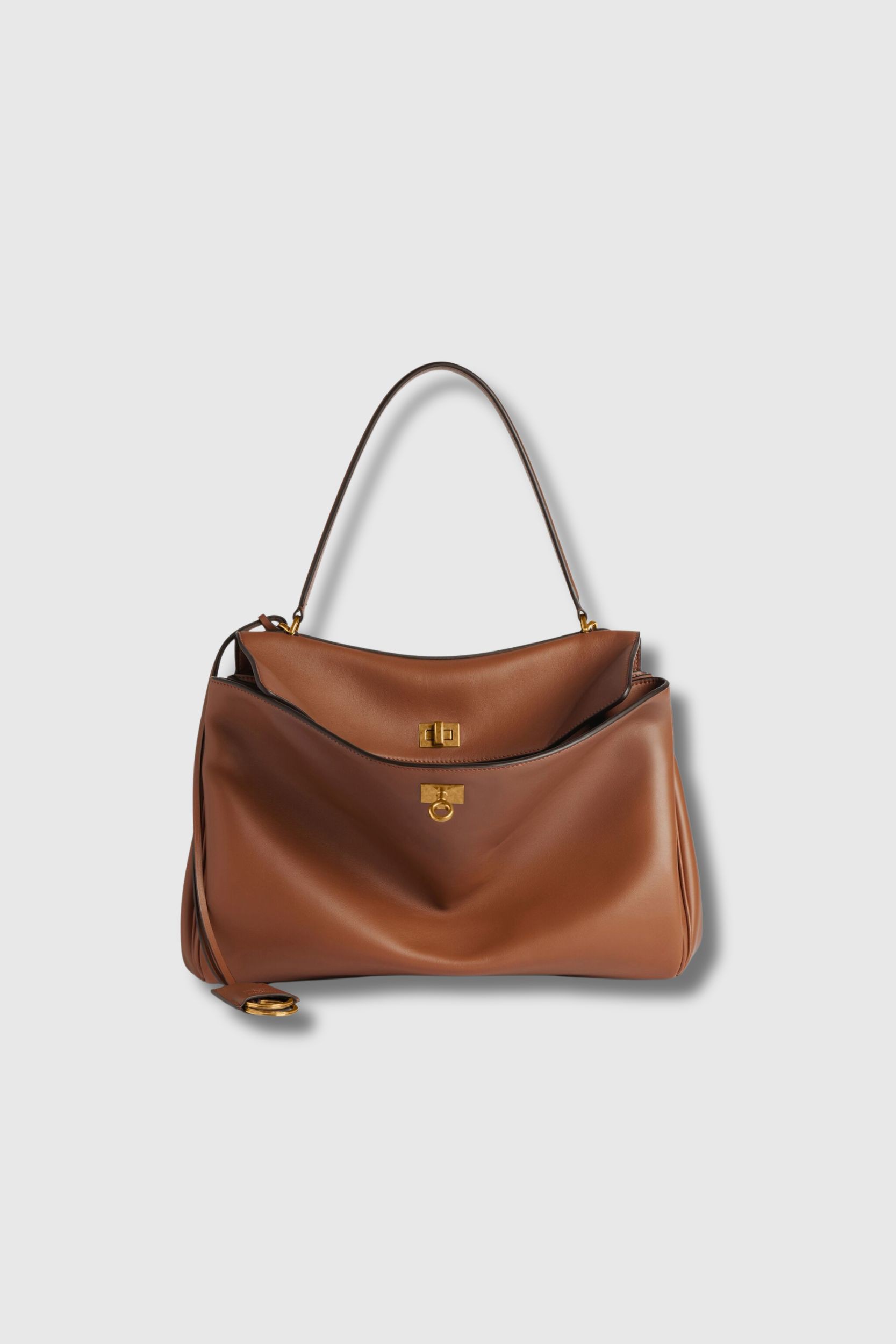 The Rodeo Medium bag by Balenciaga embodies a contemporary yet distinctive aesthetic. Crafted from smooth camel leather, it stands out with its supple texture and naturally structured drape.