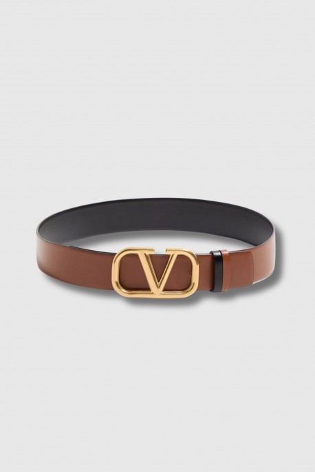 This brown and black leather VLogo belt is designed by Valentino Garavani. Reversible, it is crafted from shiny calfskin leather and adorned with the iconic VLogo Signature buckle with an aged brass finish.