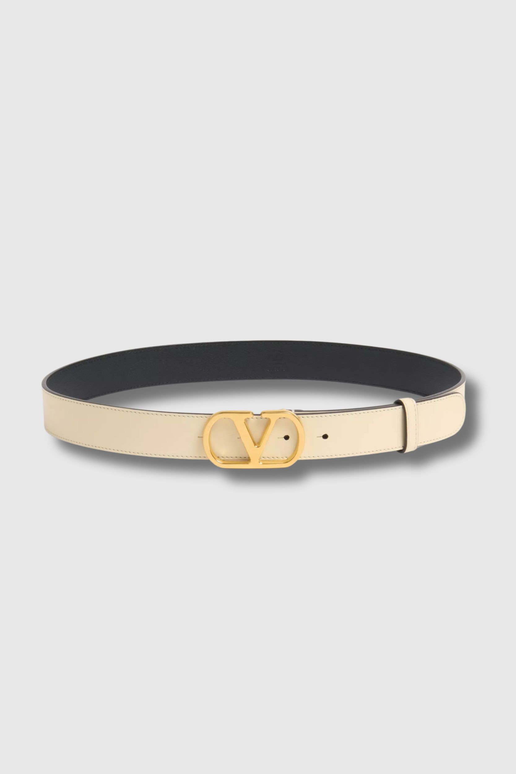 This VLogo belt in ecru leather is designed by Valentino Garavani. Crafted from shiny calf leather, it features the iconic VLogo buckle with a brushed brass finish. The exterior and interior are made from calf leather for an elegant and timeless look.