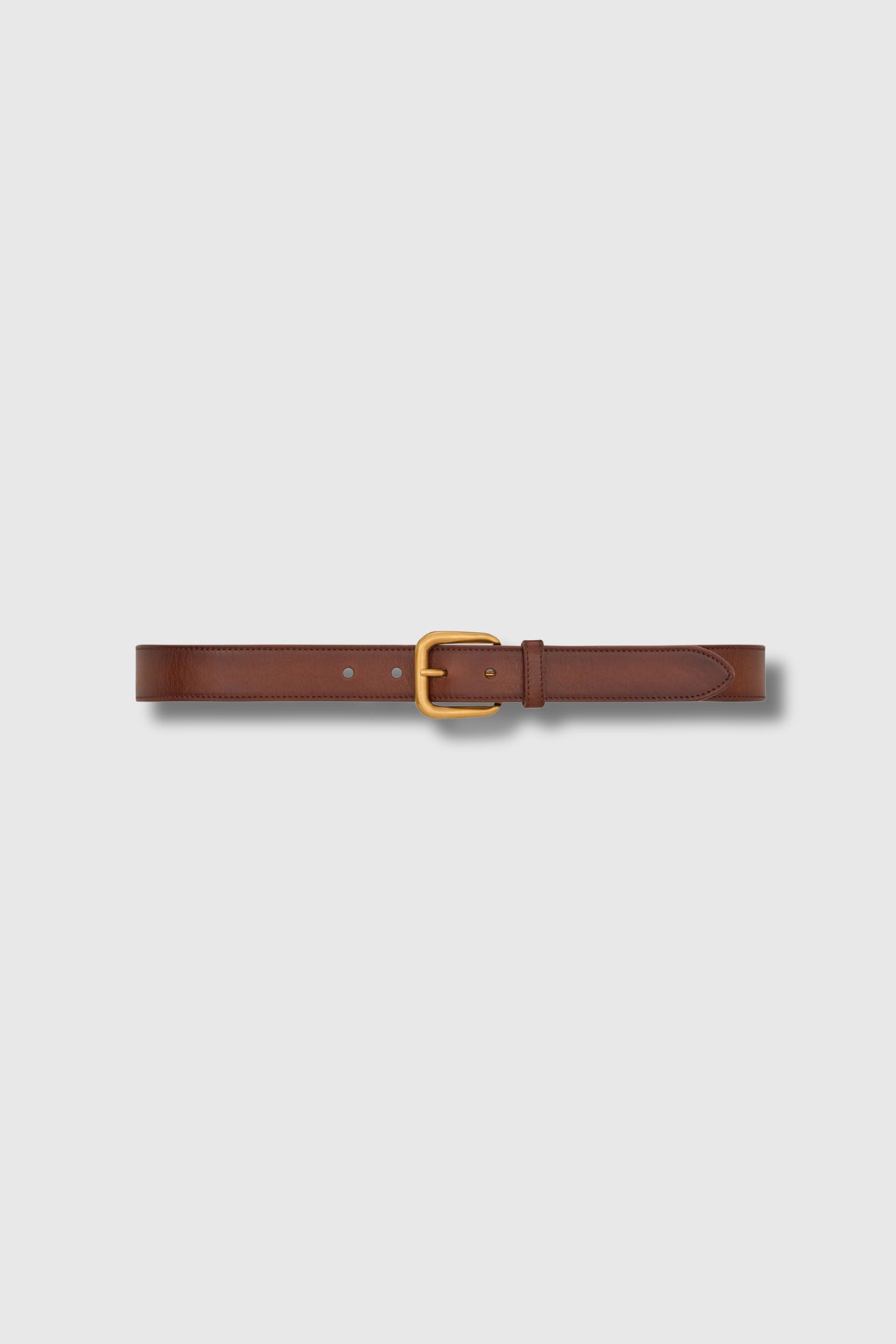 This Cassandre belt in smooth brown leather with a distressed effect by Saint Laurent embodies timeless, authentic elegance. Crafted from vegetable-tanned leather, it stands out for its subtle patina and refined look. Featuring a rectangular buckle and leather loop, enhanced with bronze metal details, it offers a polished, sophisticated finish. The adjustable pin buckle ensures a perfect fit. An iconic accessory, ideal for structuring a silhouette with character and modernity.