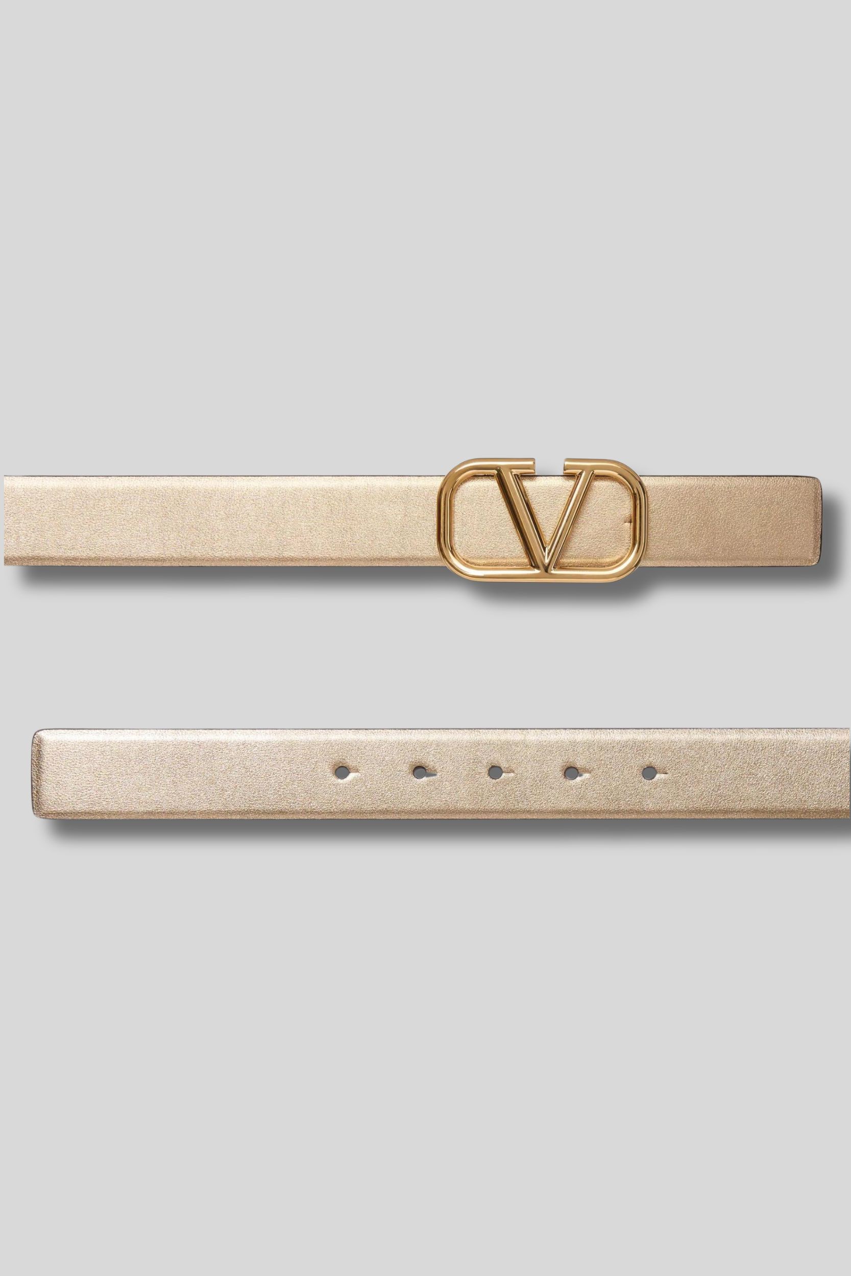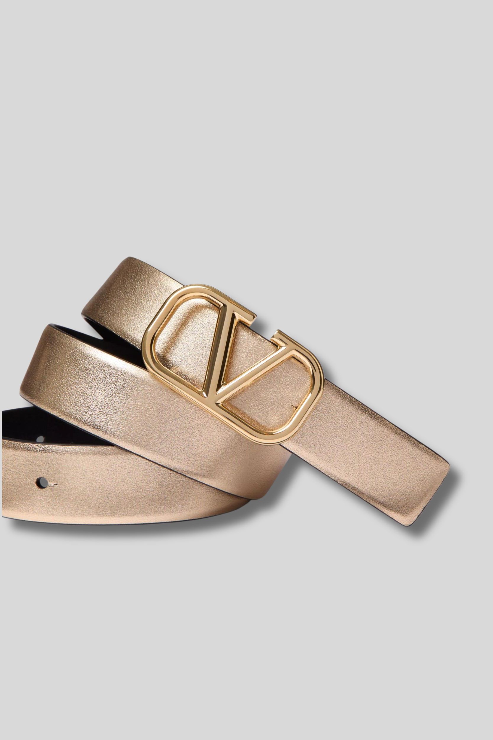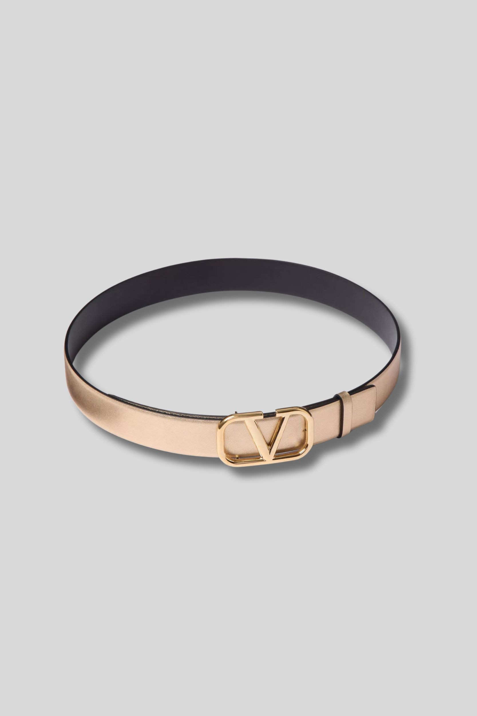 This reversible metallic calfskin leather belt is designed by Valentino Garavani. It features a VLogo Signature buckle with a light gold-tone finish.
