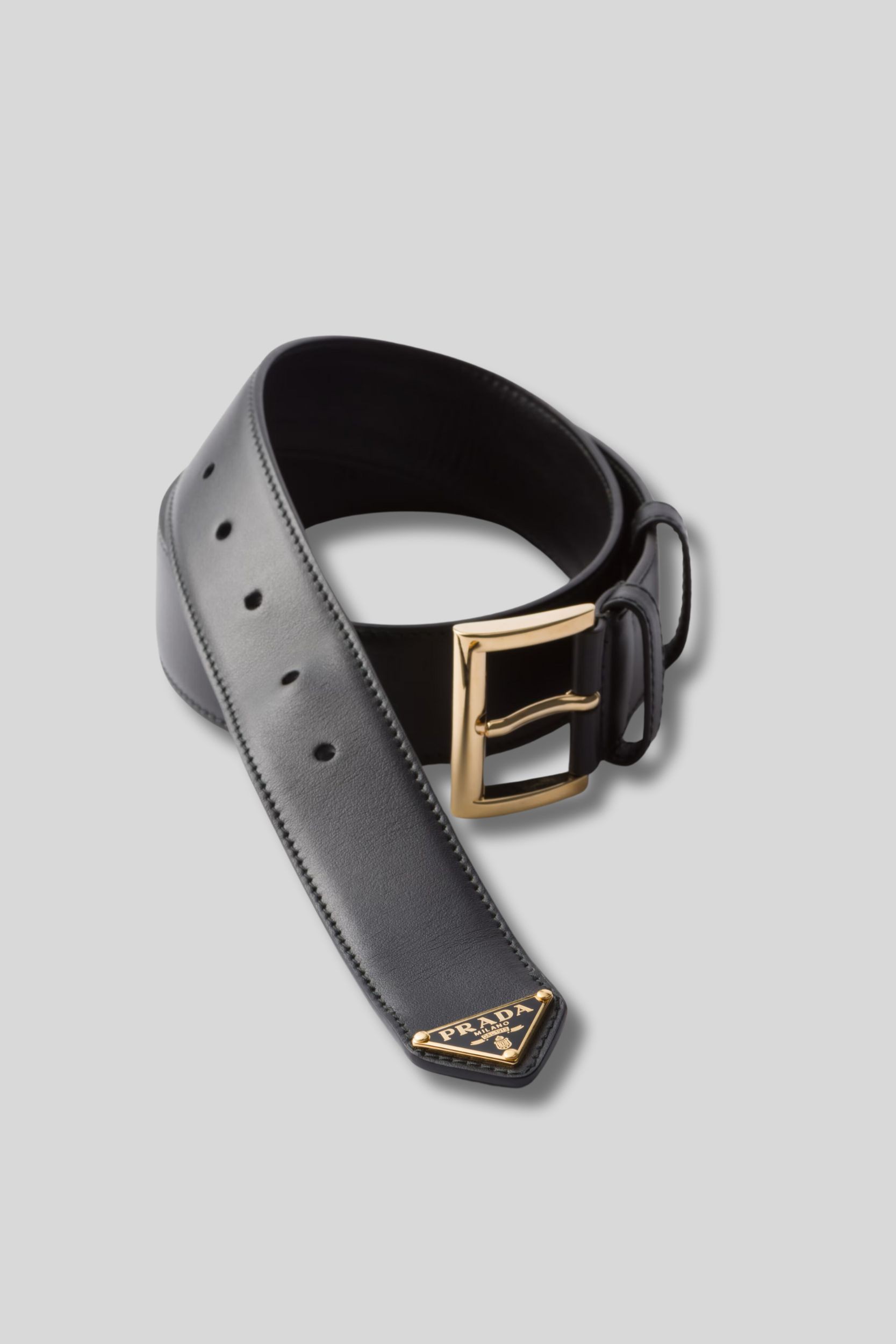 This black leather belt is designed by Prada. It features the iconic enamelled metal triangular logo at the end, which first appeared in 1913 on the trunks designed by Mario Prada.