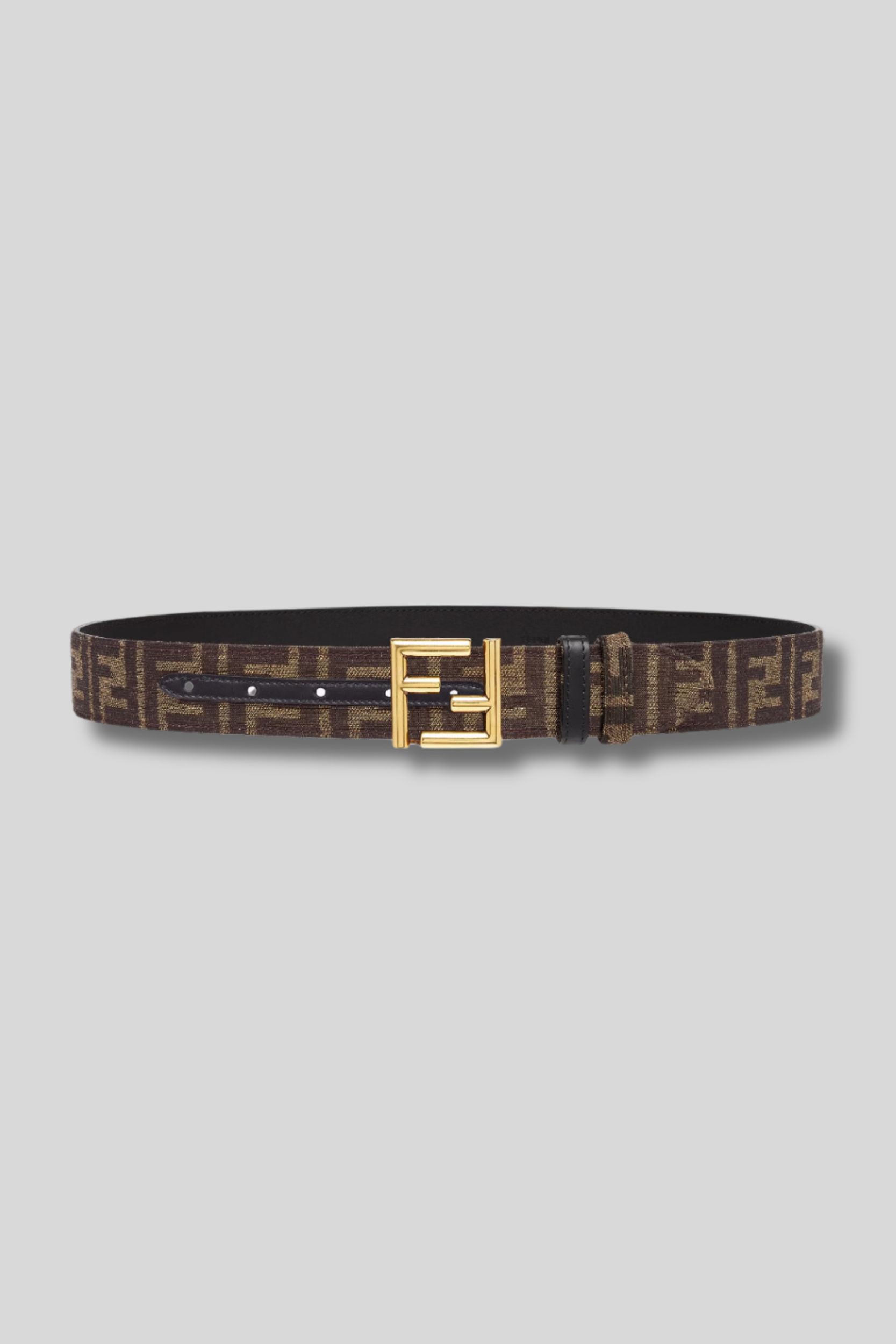 This belt is designed by Fendi. It is reversible in black leather and monogrammed FF fabric. This piece is detailed with the house's gold logo as a buckle.