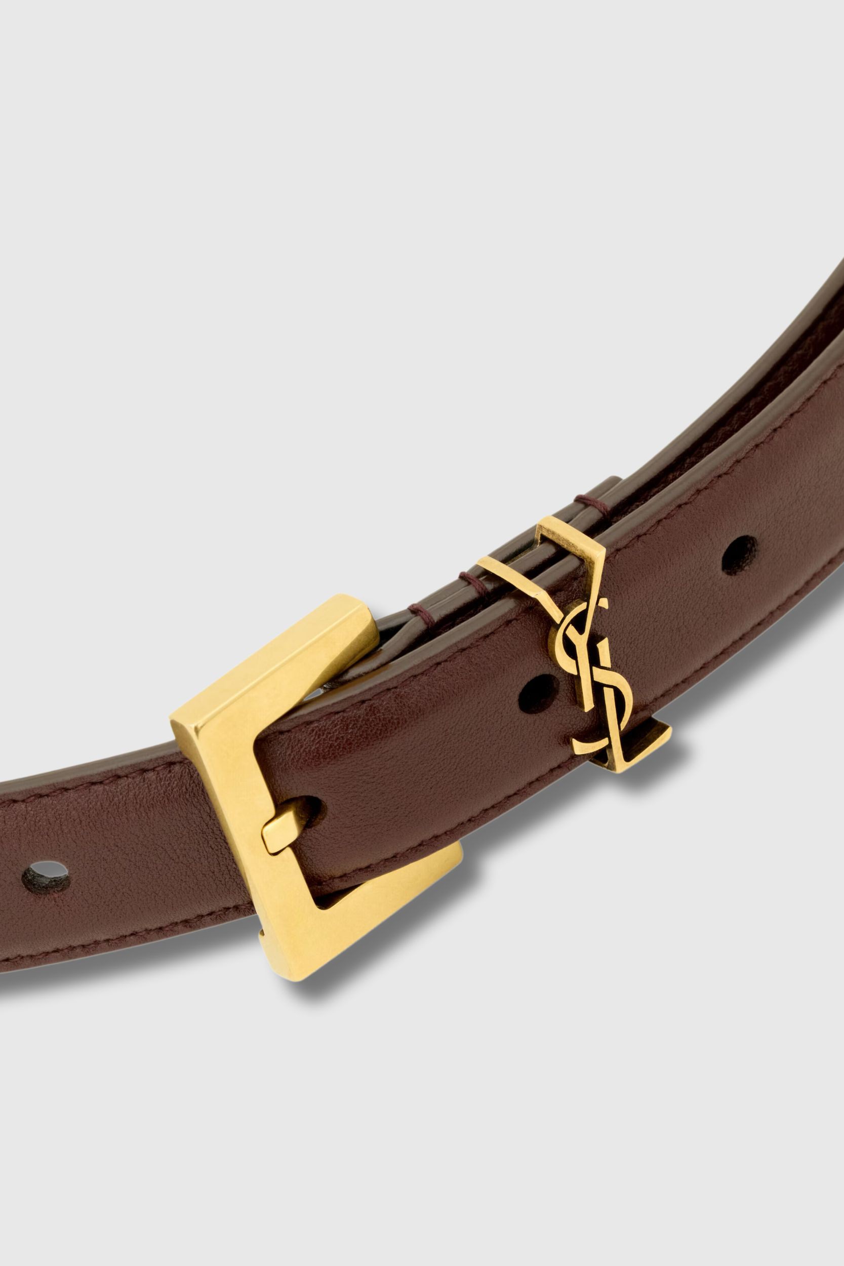 This slim golden Cassandre belt in smooth tan-red leather is designed by Saint Laurent. It features a square buckle detailed with a Cassandre loop. This piece has different size holes.
