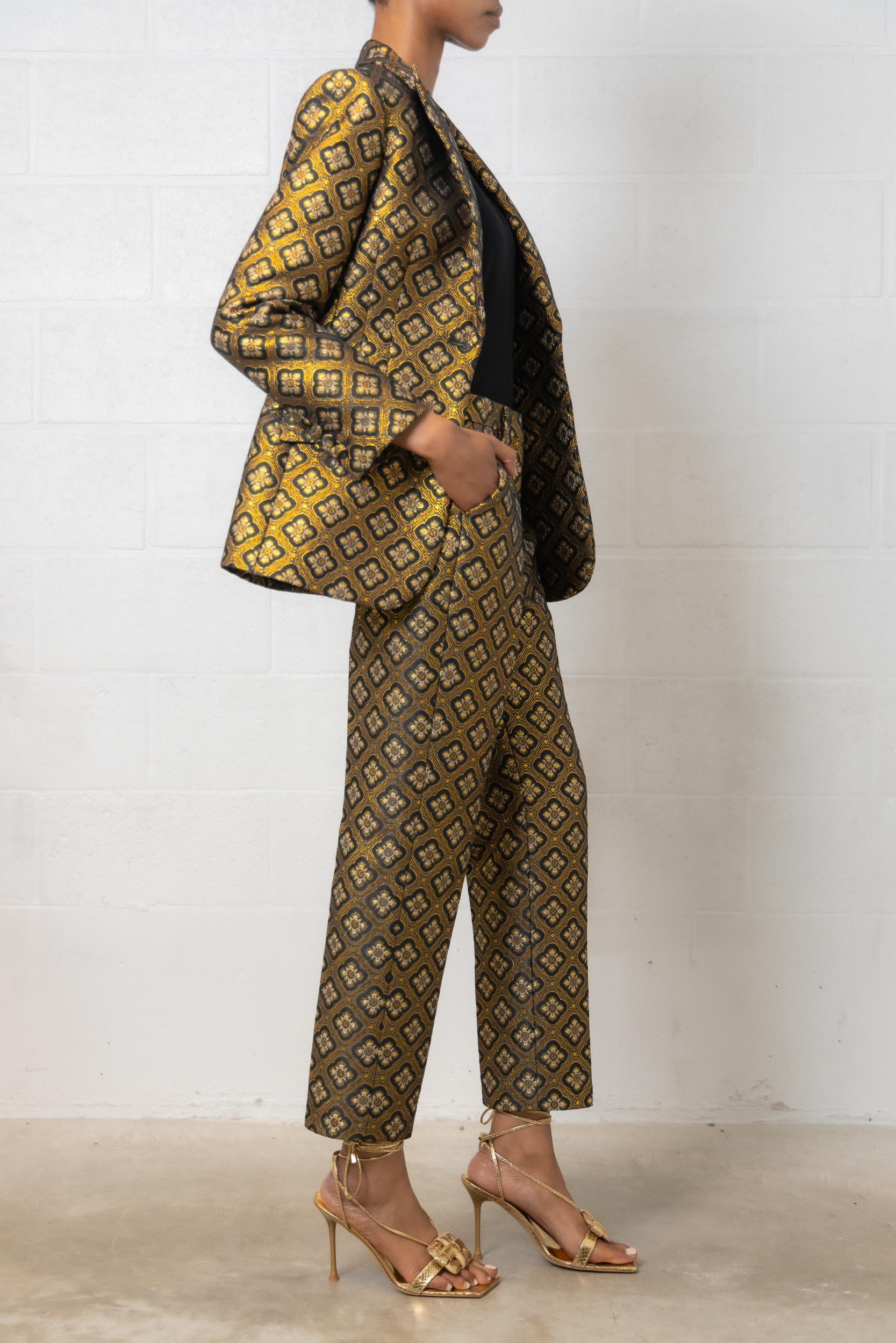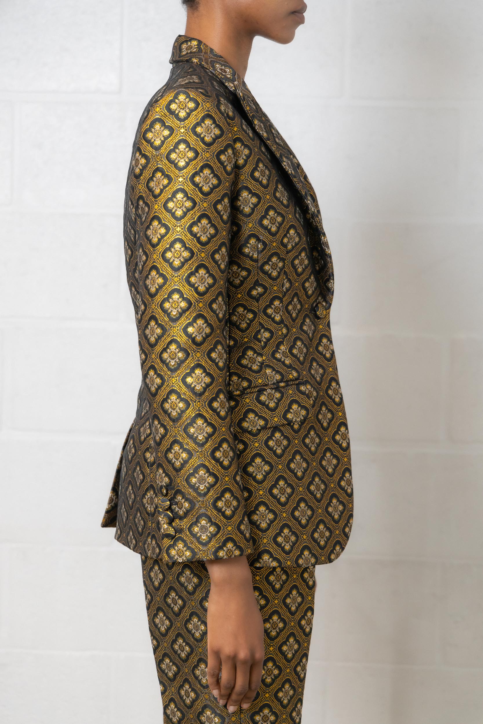 This structured blazer jacket in jacquard fabric is designed by Etro. It has a slim fit and features a jacquard print with gold medallions.