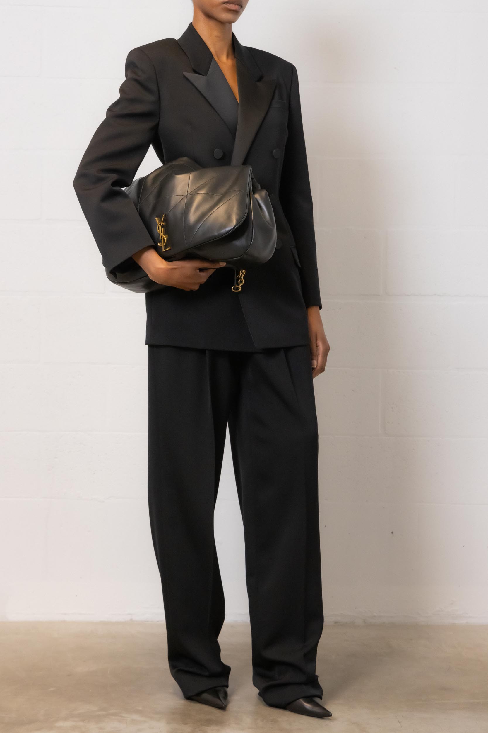 This black powder grain blazer is designed by Saint Laurent. This piece has a slim fit and is double-breasted. It features satin details, particularly on the pointed lapels.