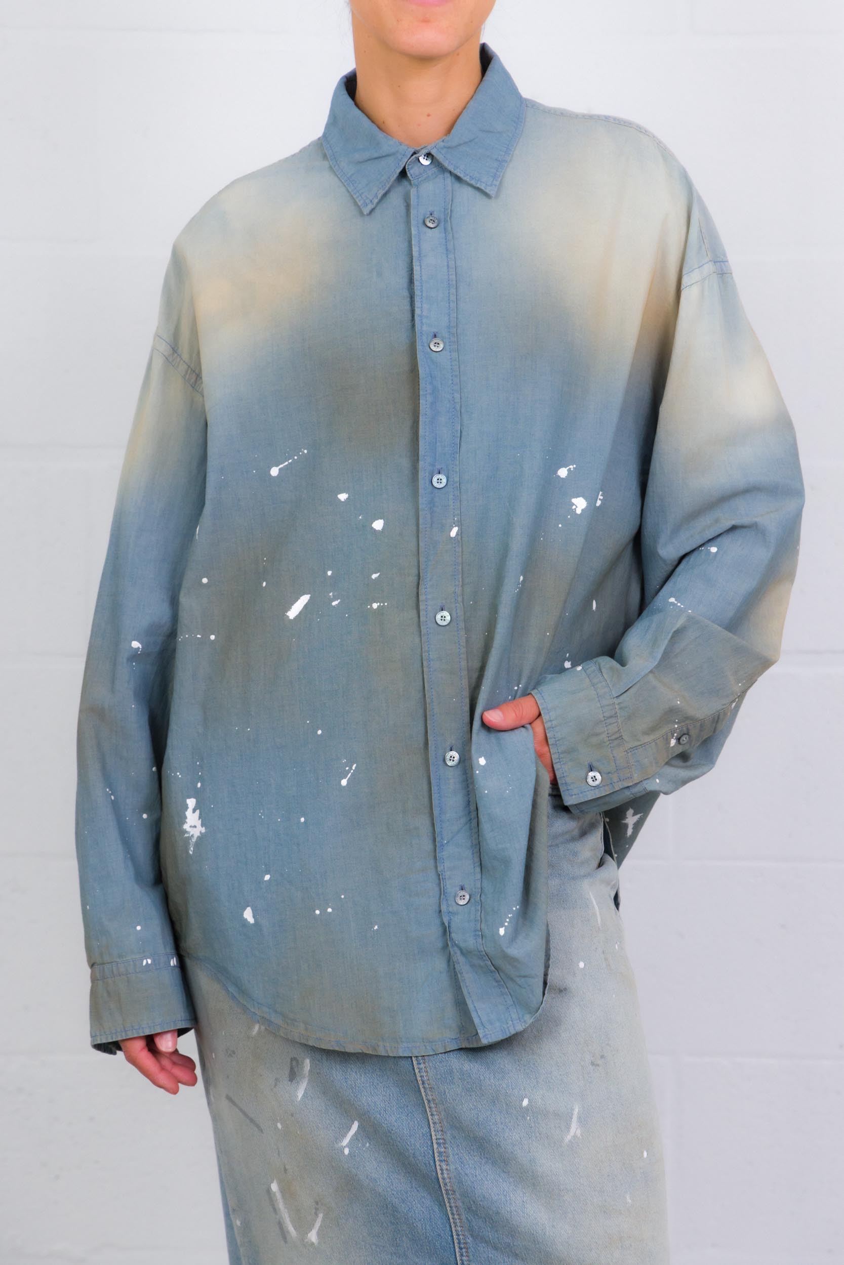 This Light Blue button-down shirt is designed by Acne Studios. It stands out thanks to its coated finish and painted splashes, giving it an artistic and contemporary look. Its loose fit and hip-length cut ensure a relaxed fit, while the Acne Studios logo on the back adds character to the piece.