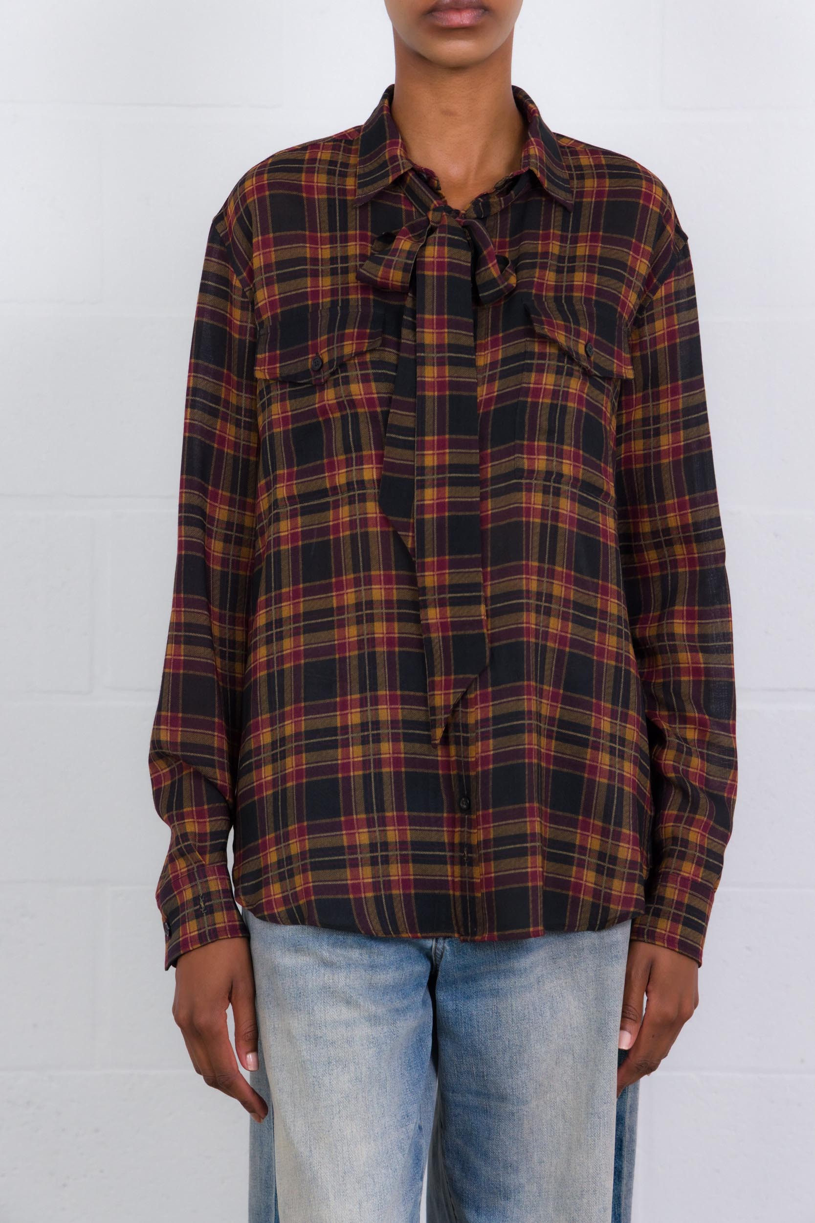 The Cassandre shirt with a tartan bow tie in wool tartan with a Scottish pattern, designed by Saint Laurent, revisits one of the House's great classics with a look that is both assertive and subtly feminine. Crafted in lightweight cotton, it stands out for its flowing cut and tie-up bow tie, adding a touch of understated sophistication to the silhouette.