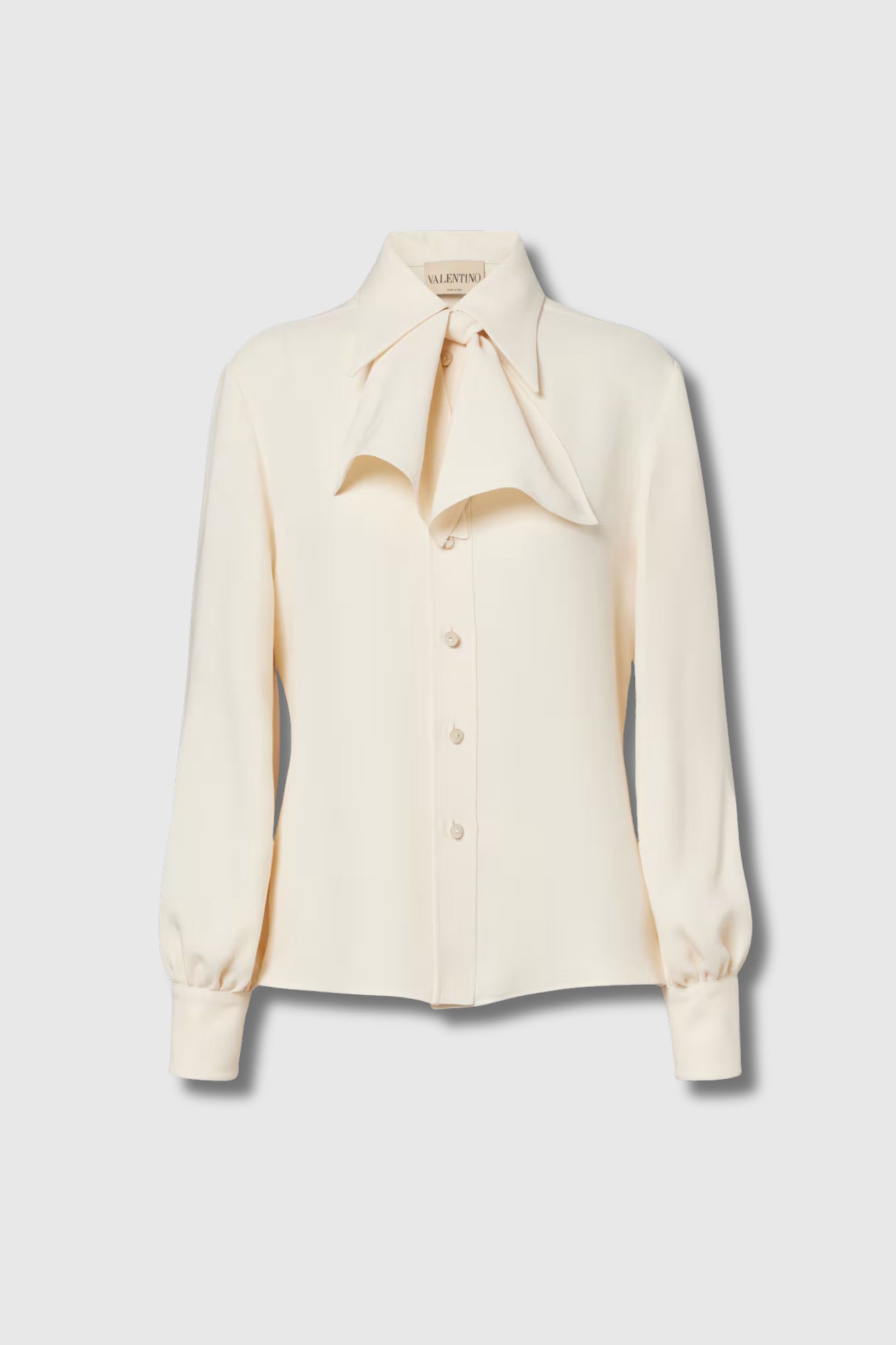 This Cady Couture shirt is by Valentino Garavani. Crafted from pure silk, it reflects the fluid elegance of the house’s signature Cady Couture fabric. Made in Italy, it is enhanced by a tie-neck detail, adding a refined and feminine touch.