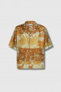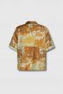 This short-sleeved silk shirt designed by Pierre Louis Mascia charms with its Cuban collar and relaxed fit, blending vintage artistry with contemporary elegance. Its pastoral pattern, rendered in warm ochre and aqua tones, is delicately highlighted by fine piping that harmonises the colours and evokes a gentle nostalgia. A refined piece to wear with slim-fit linen trousers for a sophisticated and natural look.