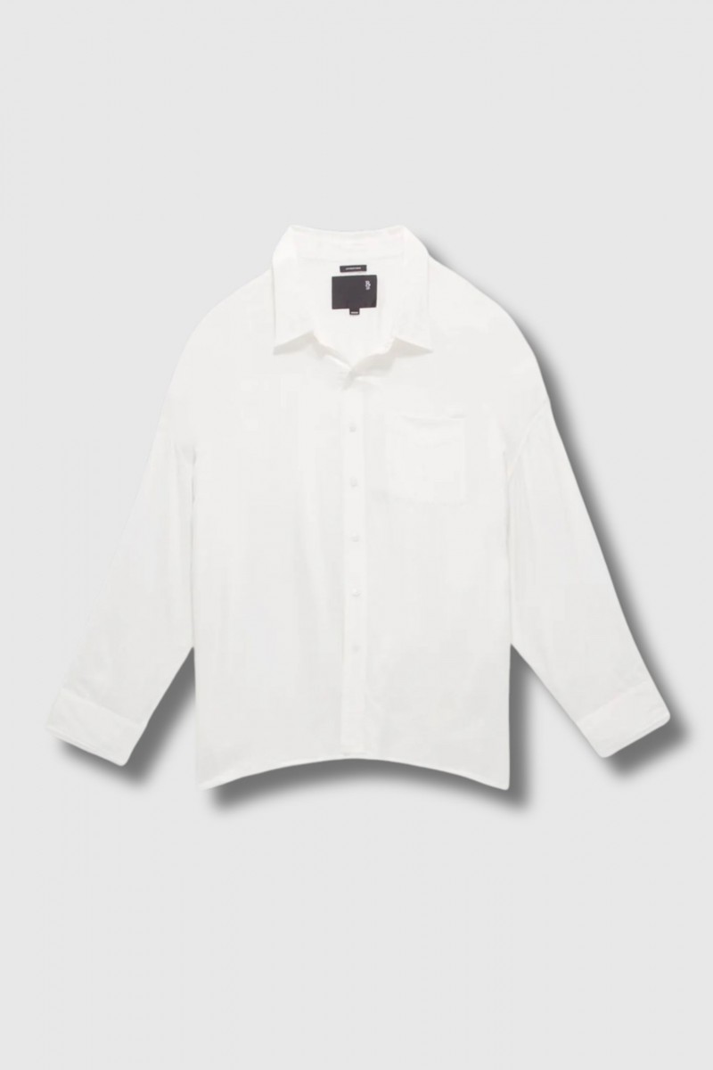 This loose-fitting white cotton shirt designed by R13 revisits the classic button-down with an oversized cut and a drop collar that give it a relaxed, contemporary look. Featuring a patch pocket on the front, it combines simplicity and attitude, perfect for structuring a casual silhouette with a touch of nonchalant elegance.