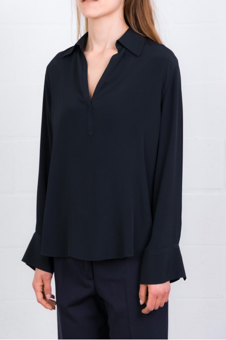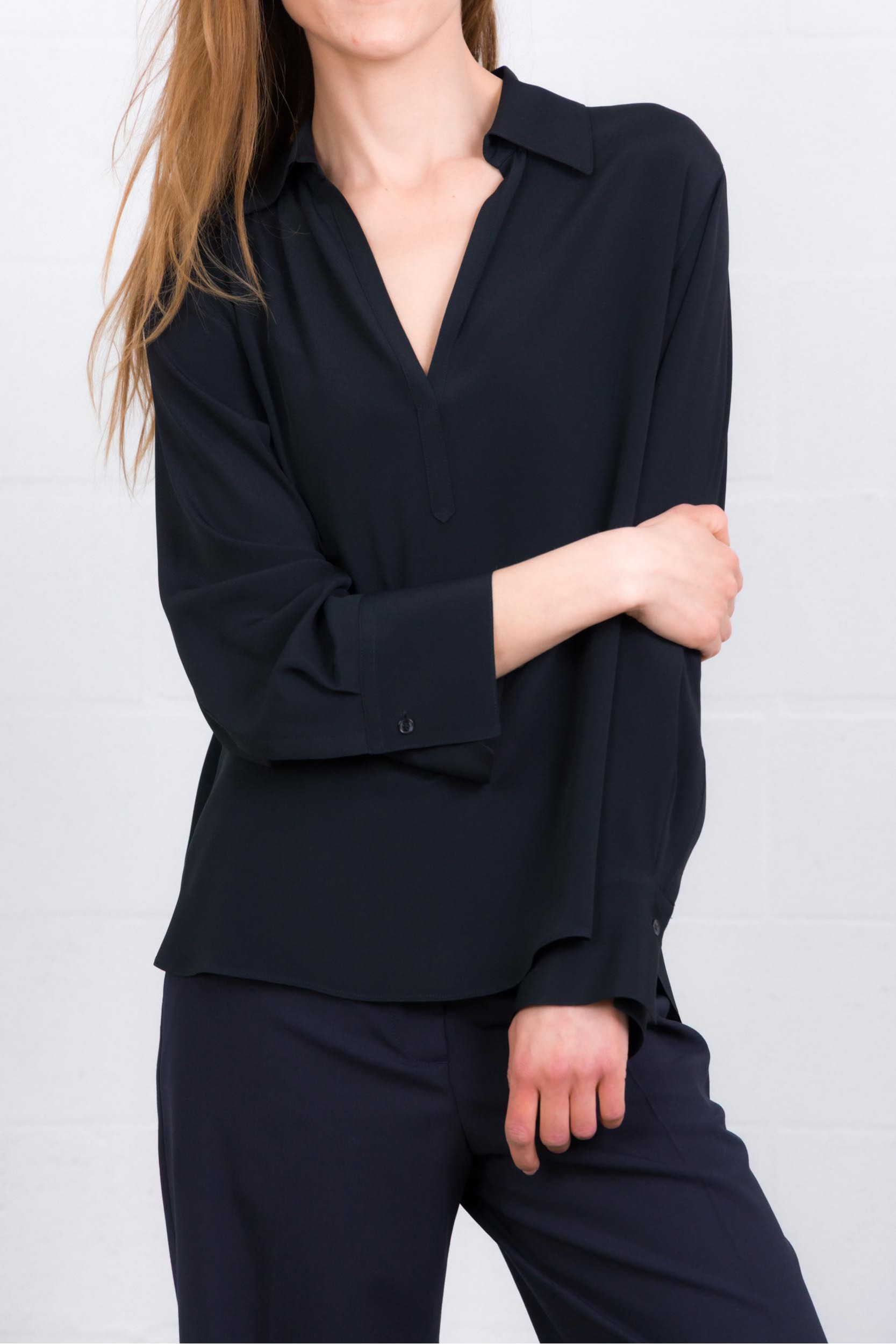 This flowing black V-neck shirt is by Seventy. It features a loose fit, long sleeves, and a V-neck.