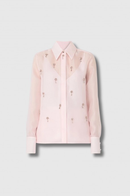 This powder pink silk Agi jewelled shirt by Max Mara revisits masculine style with exquisite elegance. Crafted from pure silk organza, it features a straight cut enhanced by delicate embroidery on the front. The small collar and high cuffs are adorned with jewelled buttons, adding a refined touch. Featuring long set-in sleeves, a concealed button closure and a rounded hem with side slits, it comes with a matching slip with thin straps for a lightweight look.