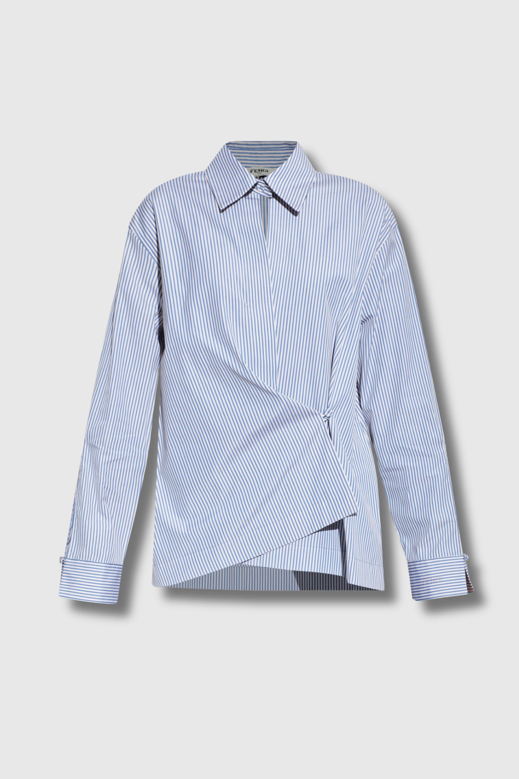 The blue and white striped shirt by Fendi embodies sophisticated elegance with subtle detailing. Presented in a light blue shade with fine white stripes, it features a timeless long-sleeve cut with wide cuffs. The asymmetric draped hem adds an artistic and distinctive touch. Crafted from lightweight, silky cotton, the garment ensures exceptional comfort, while the variation in stripe direction and precise stitching creates a refined sense of depth and dimension.