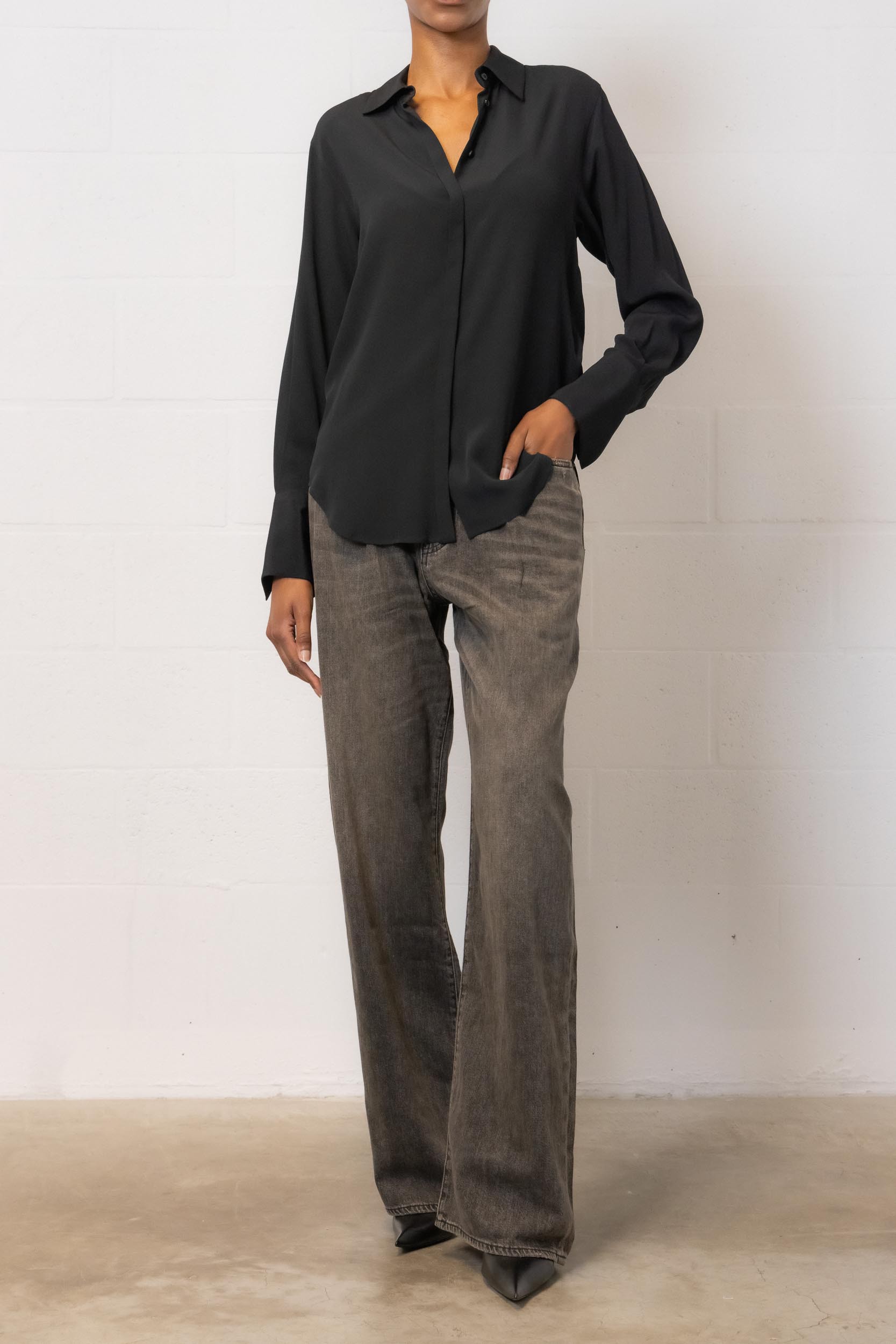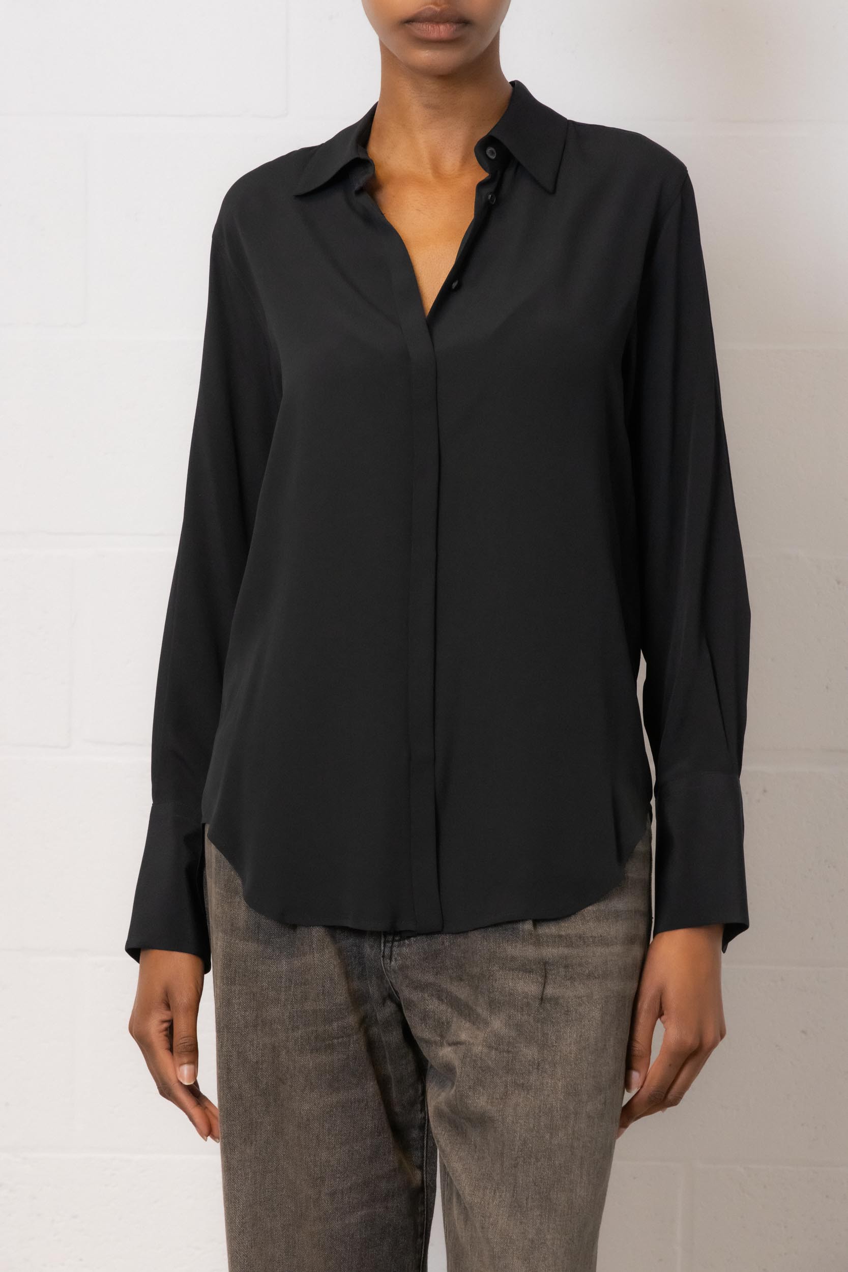 This flowing black silk shirt is designed by Seventy. It has a straight cut and a round hem.