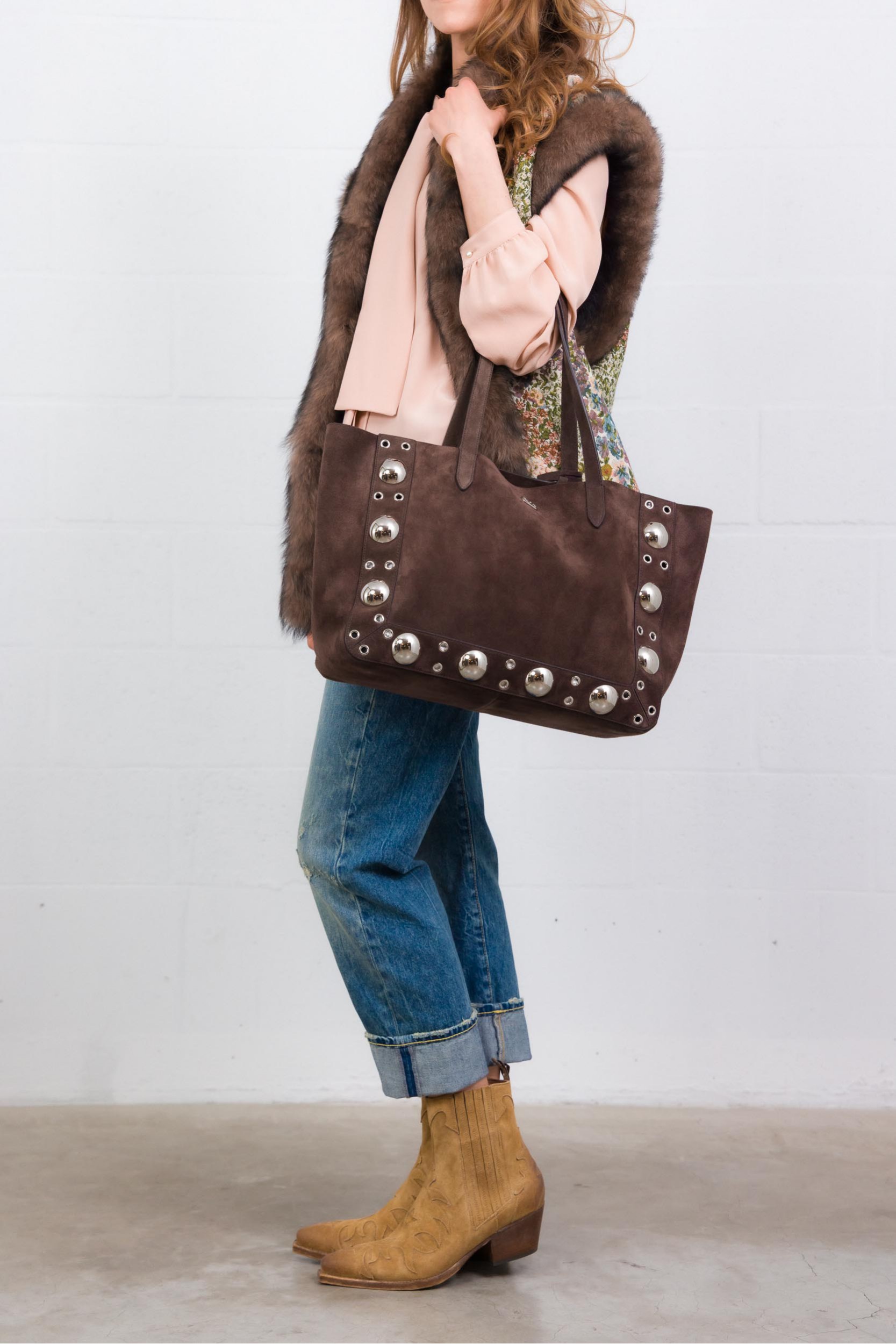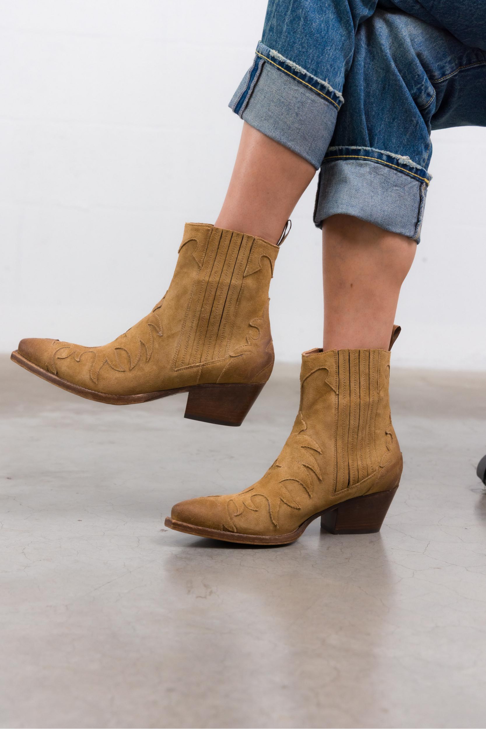 Camel suede cowboy boots with distressed soles