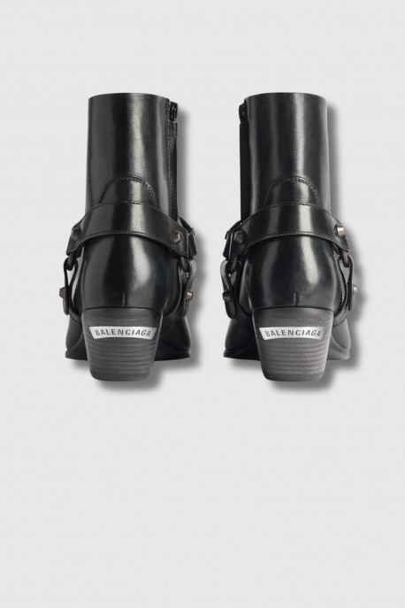 These black Memphis cowboy boots are by Balenciaga. Crafted from supple calfskin leather, these ankle boots feature a semi-square toe and a 55 mm arch that adds an elegant touch to their western-inspired silhouette. The beveled heel enhances their contemporary look, while an inner zip fastening ensures easy wear. The shaft is detailed with a stud-embellished harness, bringing a bold and distinctive character to the design. At the back, a metal plate on the heel highlights the house’s signature detail. The boots are finished with a sleek black sole.