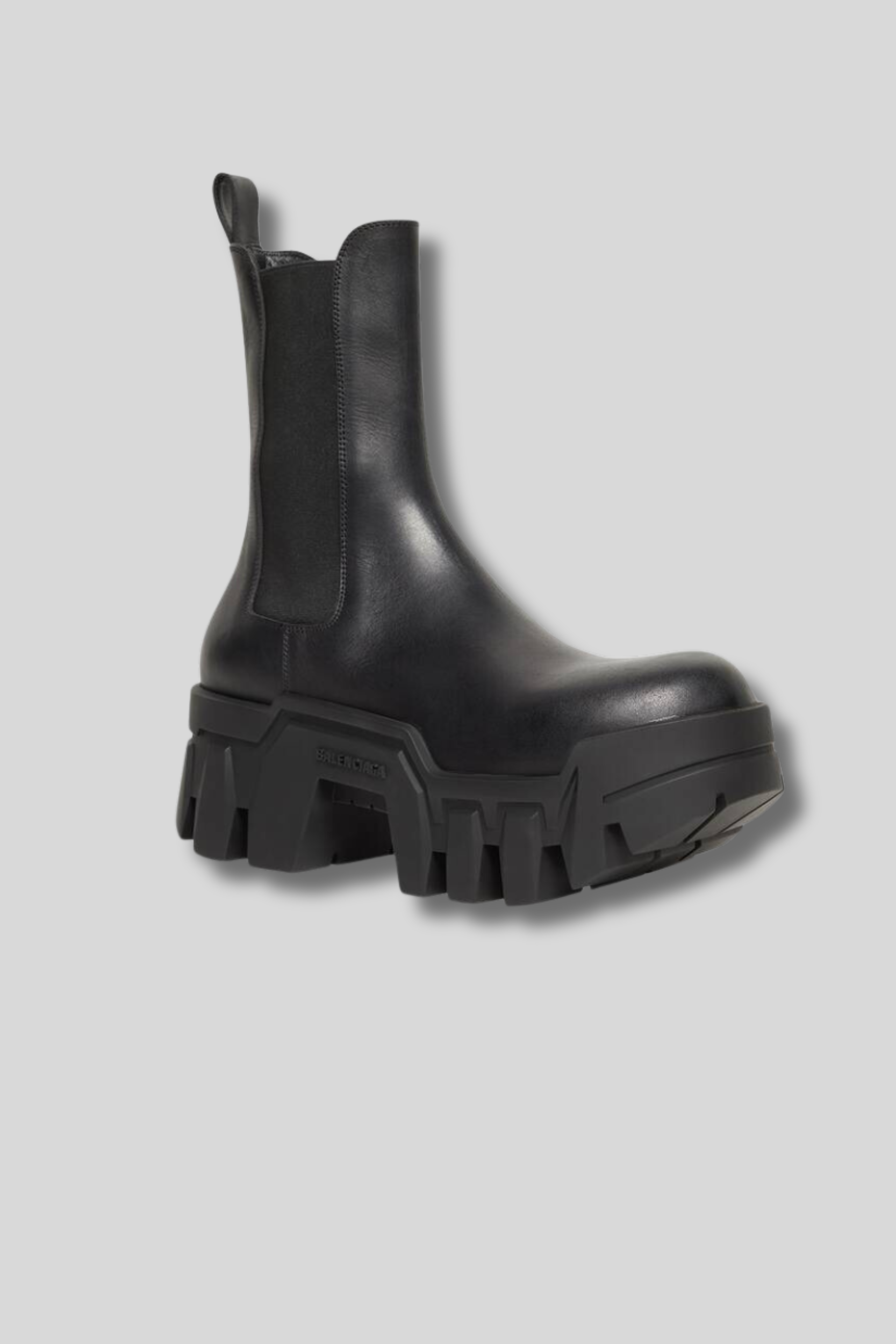 These Chelsea Bulldozer ankle boots in smooth matte black calf leather are designed by Balenciaga. With their oversized design, they stand out thanks to their 80mm soles. They feature an elastic band on each side of the boot and a leather buckle at the back. The house logo is embossed on the outside of the sole.