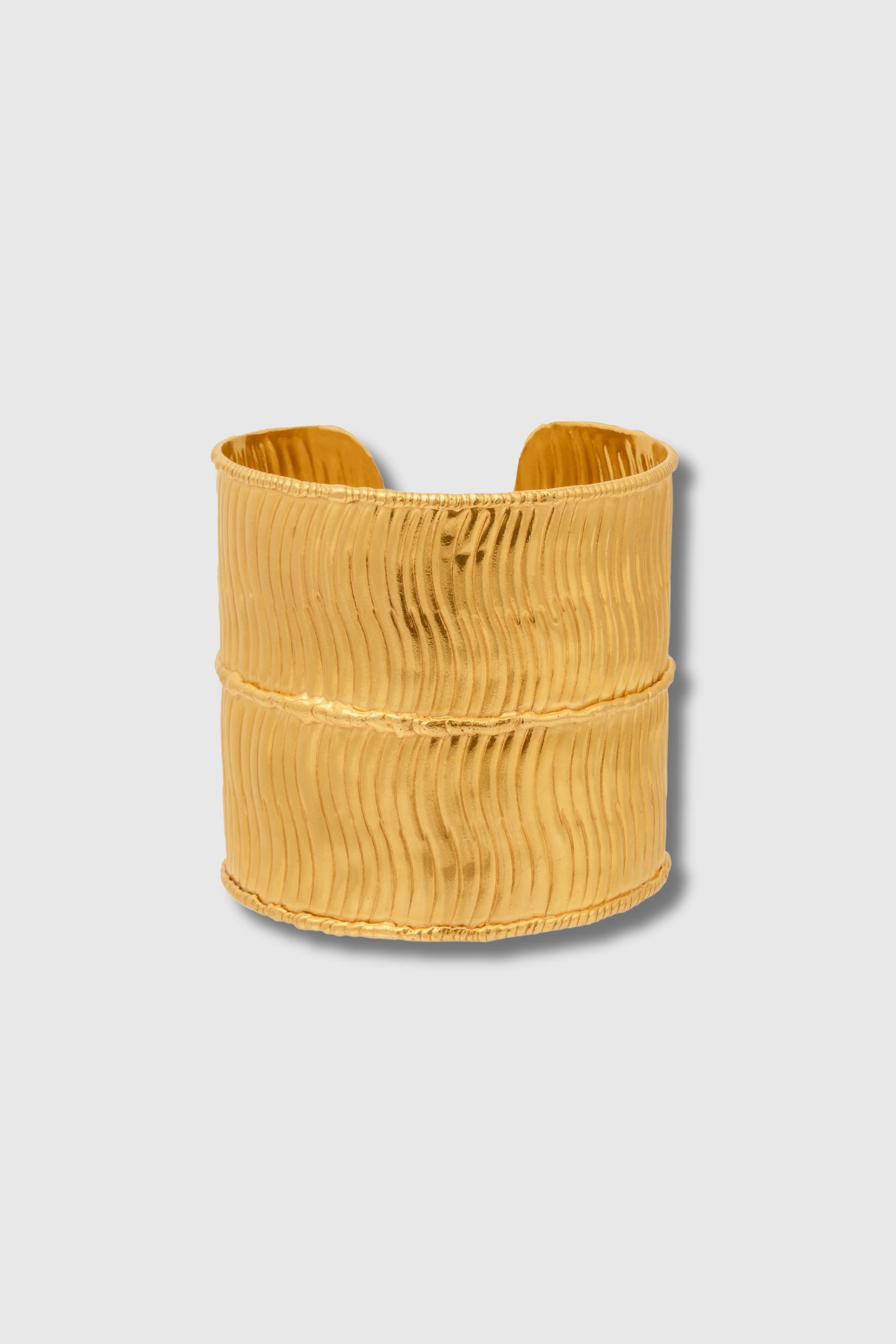 This Bamboo Gold cuff bracelet is designed by Sylvia Toledano. Crafted in gold-plated metal, it stands out for its wave-like relief pattern reminiscent of carved bamboo. An elegant and timeless piece, emblematic of the designer's craftsmanship.