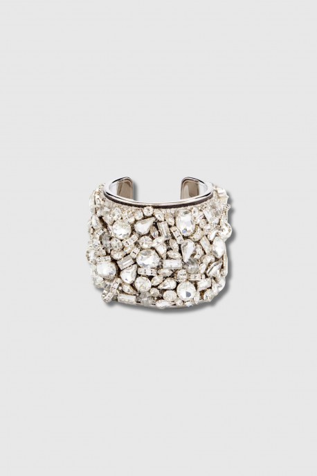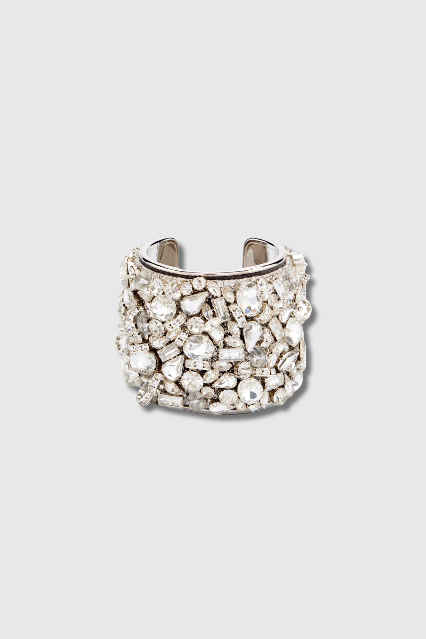 This silver rhinestone cuff bracelet is by Dries Van Noten. Crafted from silver-tone brass, it features shimmering crystal embellishments. A true statement piece, it adds an artistic and luminous touch that instantly elevates any look.
