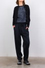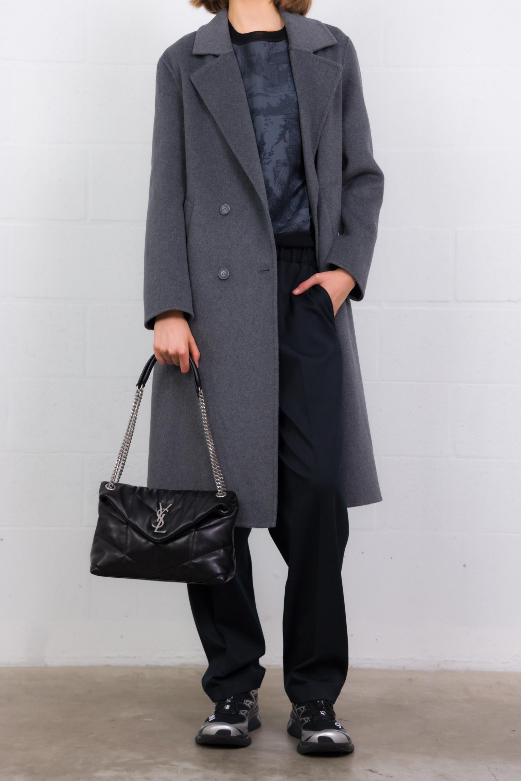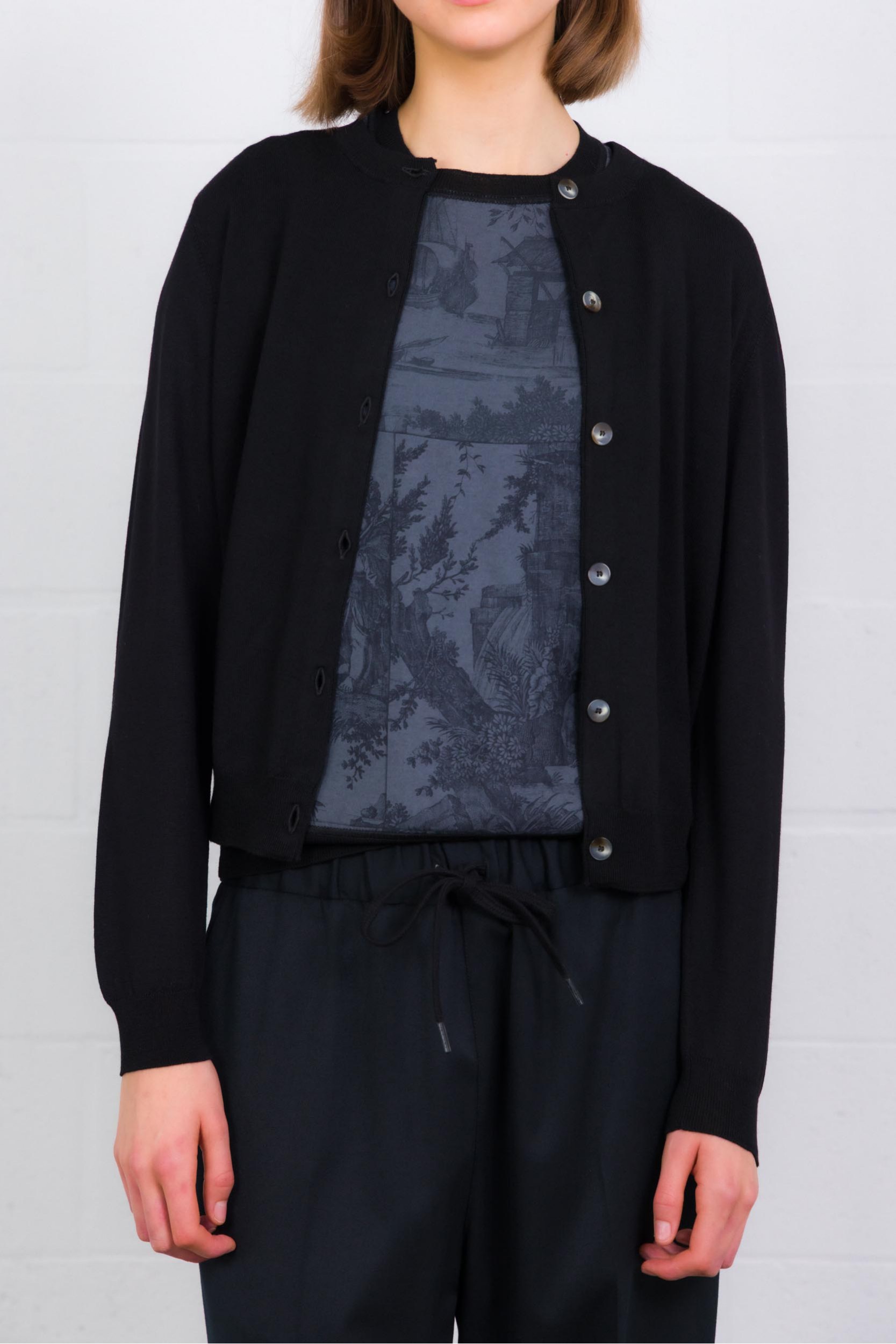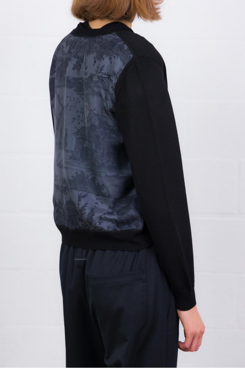 This grey silk and cashmere cardigan is designed by Pierre-Louis Mascia. It features a straight cut, round neckline, long sleeves and button fastening at the front. The back and front are embellished with a print inspired by classic landscapes, contrasting with the plain sleeves and trim. A style that combines softness, refinement and modernity.