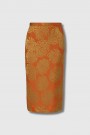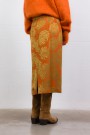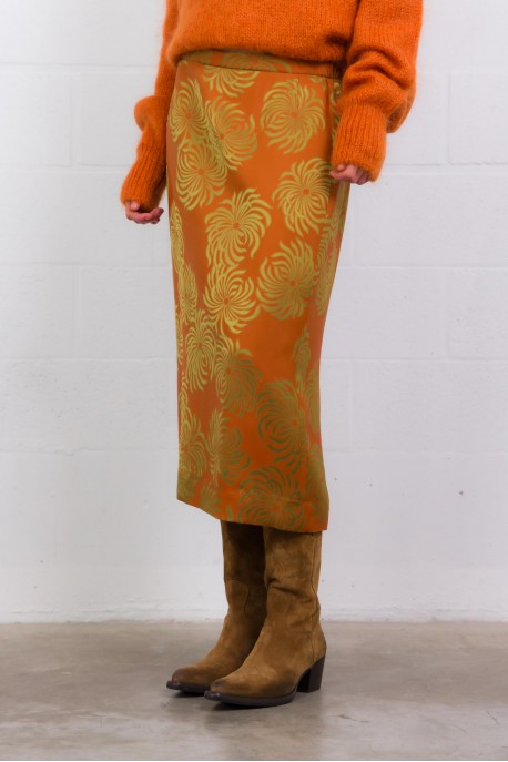 This midi skirt by Dries Van Noten embodies artistic elegance. Its fluid silhouette moves gracefully, while the abstract print in shades of orange and green brings a bold radiance to the look. Crafted from a refined blend of 52% acetate and 48% viscose, it drapes beautifully with a luxurious finish. The midi length, enhanced by a discreet back slit, highlights every step with sophistication. A contemporary, statement-making piece designed for women who embrace style with confidence.