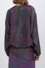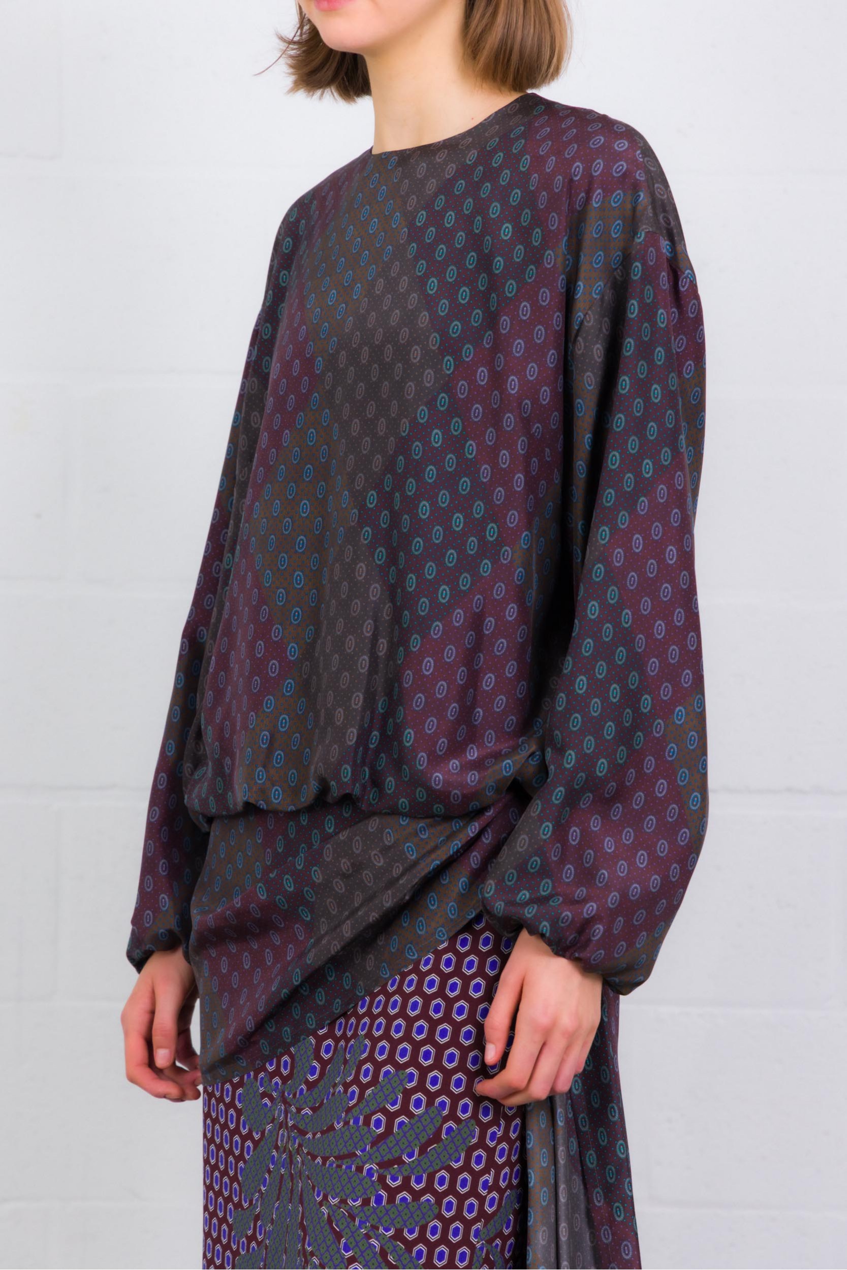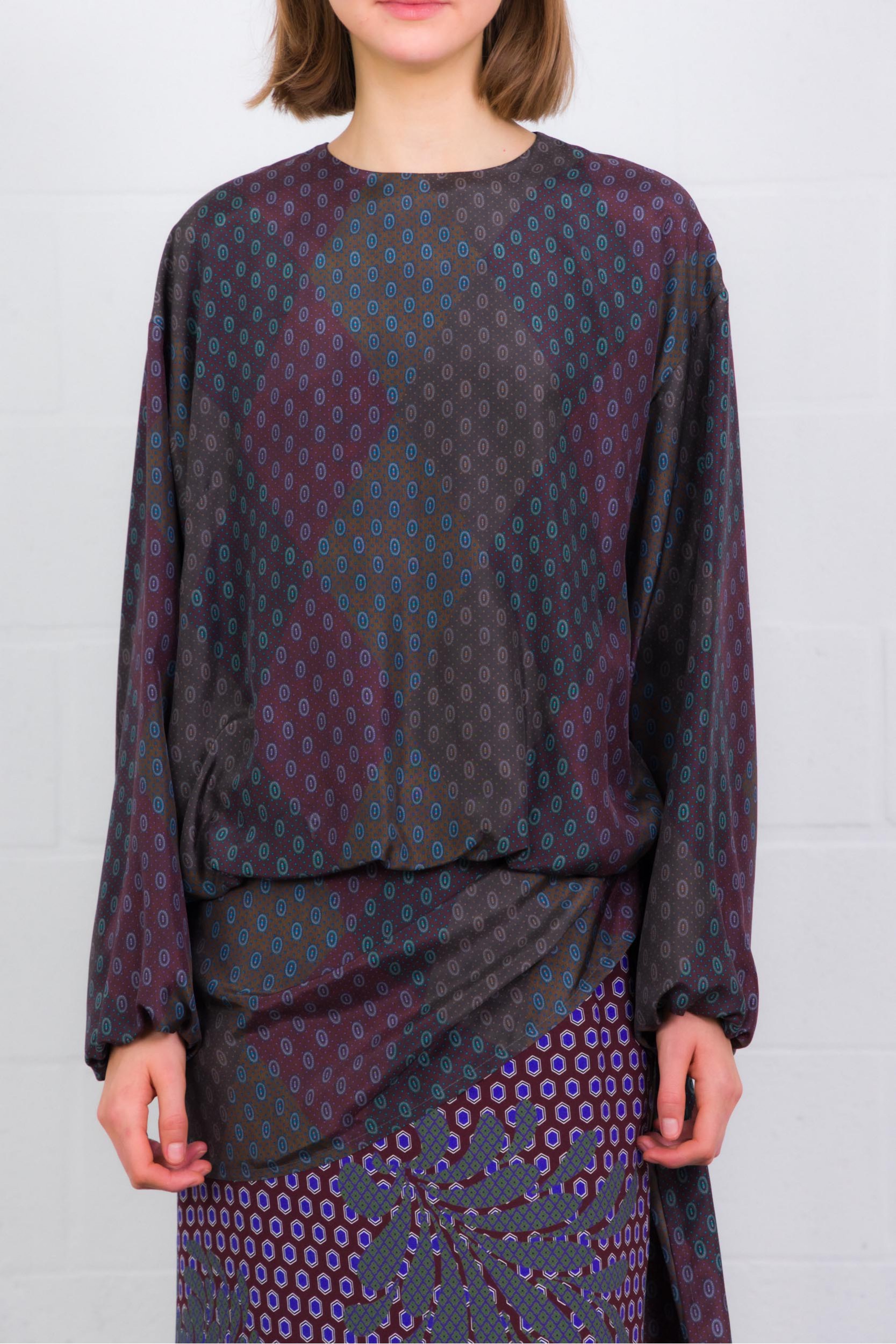 This cocoon-style top in burgundy silk captivates with its seamless blend of soft sculptural form and fluid motion. The bold Tie print paired with an Argyle motif lends a contemporary, artistic flair. Featuring a relaxed fit, long sleeves with elasticated cuffs and waistband, and a refined round neckline, the design exudes understated elegance. Fully lined and secured with a single-back button closure, this piece offers a sophisticated, lightweight finish.