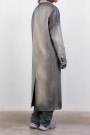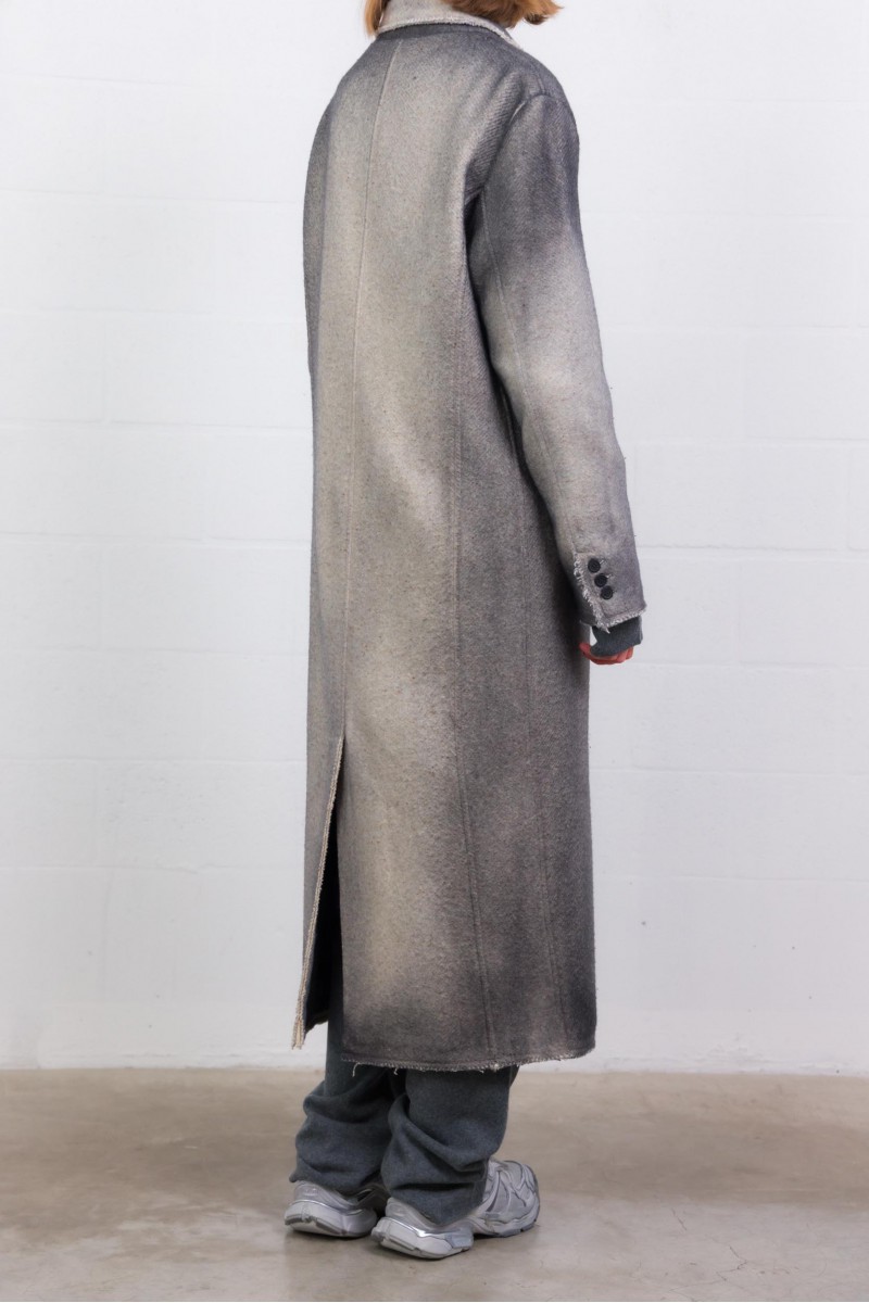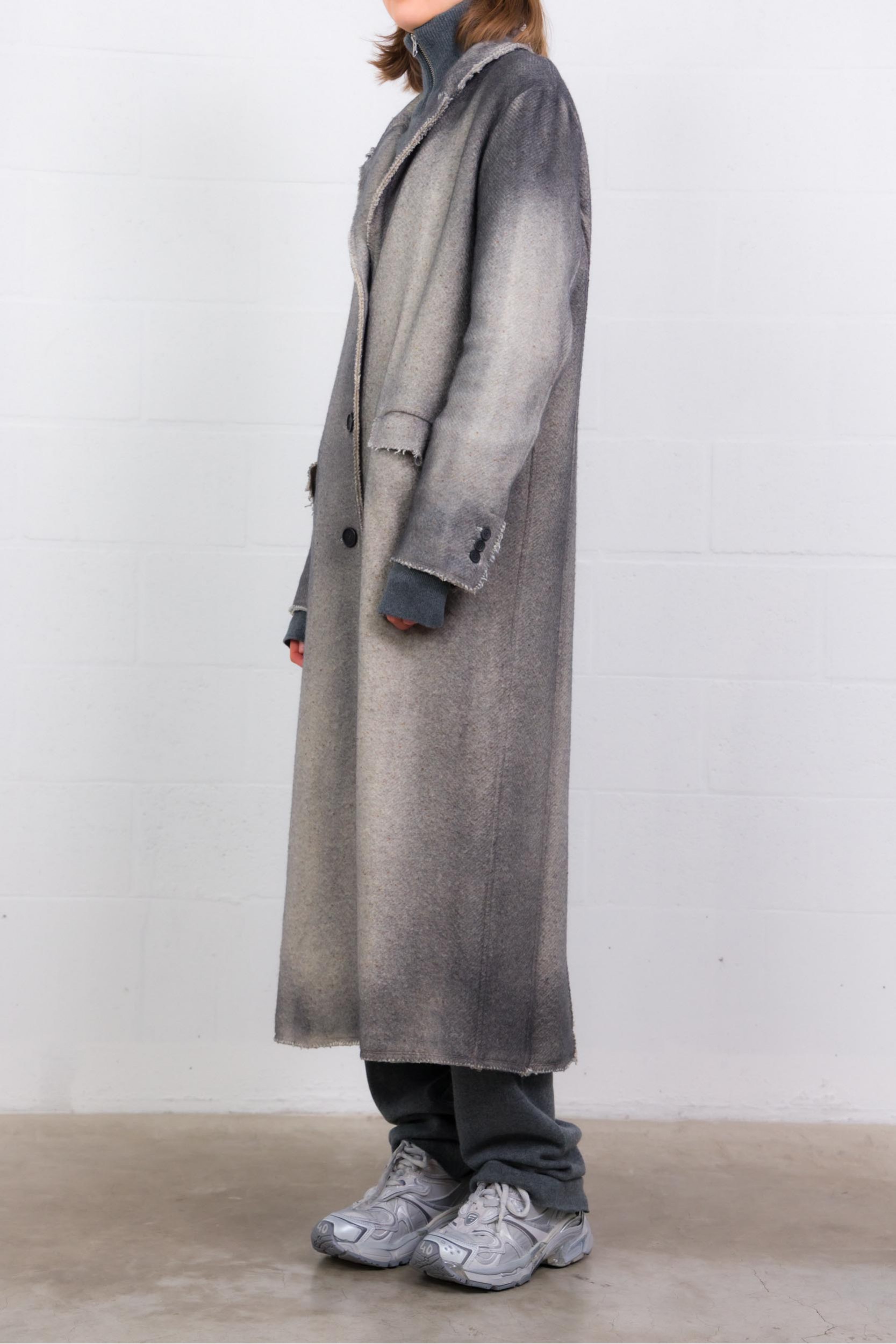 This long Avant Toi coat embodies Italian craftsmanship with its distinctive hand-dyed gradient, shifting beautifully from light grey to deep charcoal. Crafted from a luxurious wool and cashmere blend, it offers a soft, fluid drape and a refined texture.