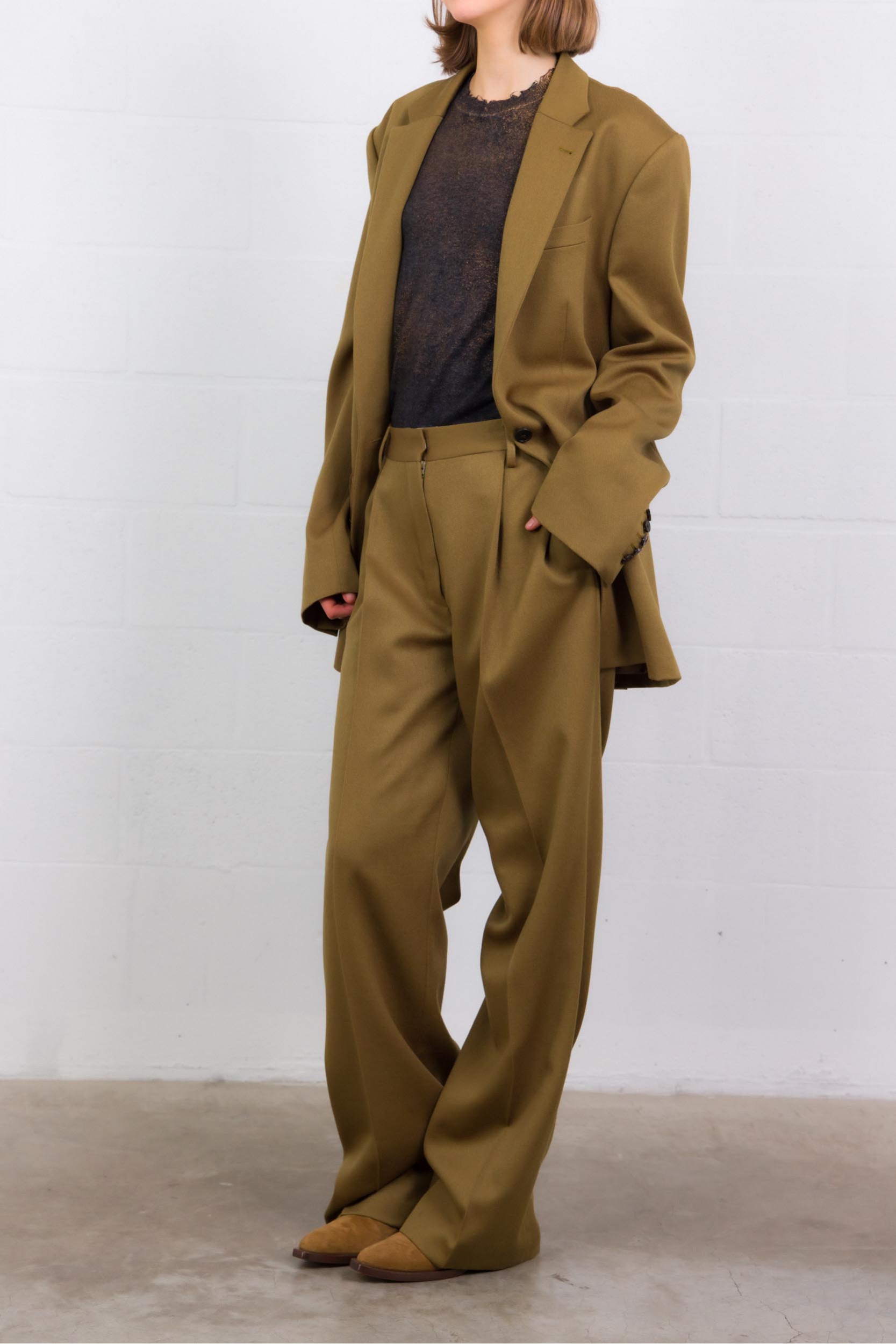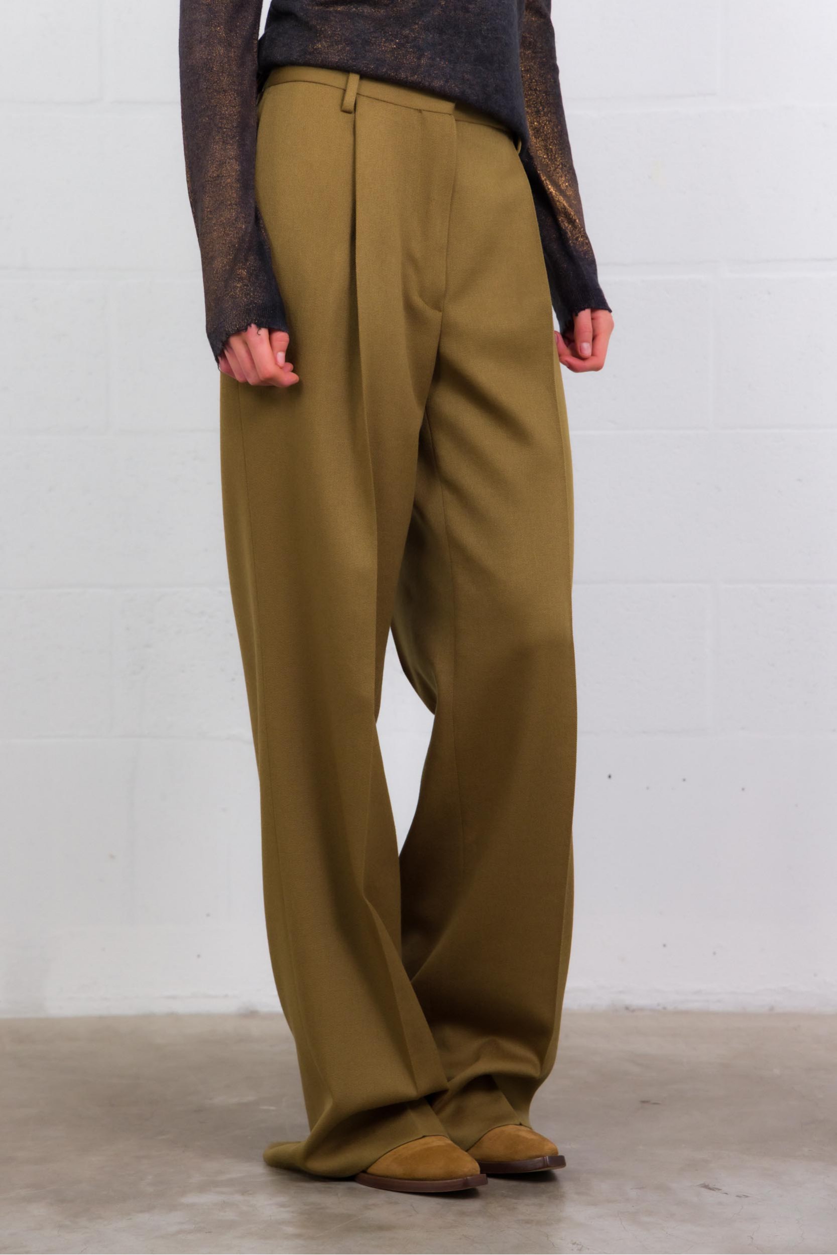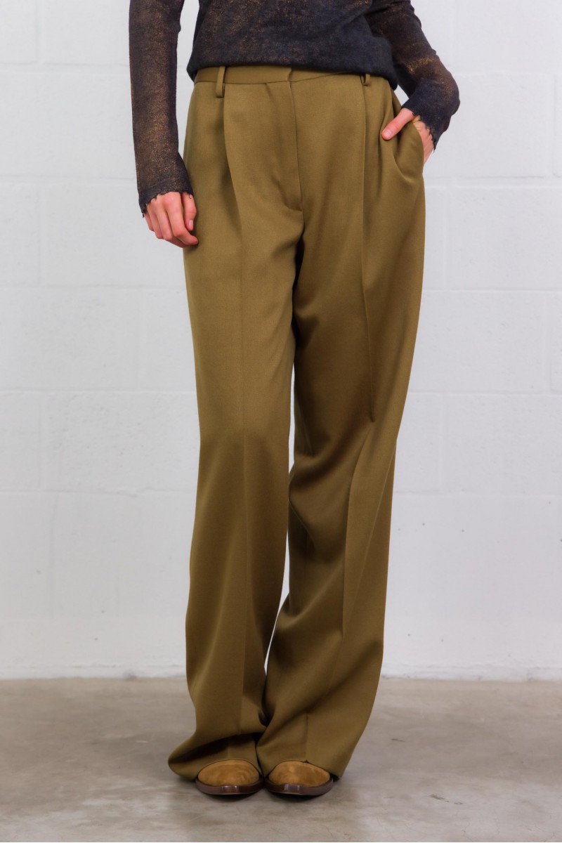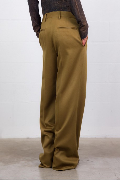 These Dries Van Noten trousers are crafted from 100% lustrous wool, embodying refined tailoring with a timeless appeal. Featuring a straight, regular fit with elegant pleats, they offer a fluid, flattering silhouette. Practical by design, they include side slit pockets, back welt pockets, belt loops, and a classic button-and-zip closure—a wardrobe staple for autumn and winter.