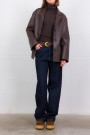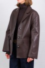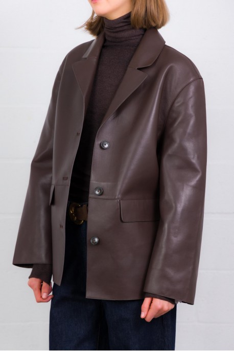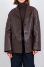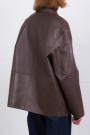 A hybrid statement piece blending boldness and refinement. The exterior features smooth lambskin leather, while the interior showcases a two-tone houndstooth fabric that peeks through on lapels and accents. With a slightly oversized workwear silhouette, its patch pockets and concealed button placket offer utility and style. Hand-dyed edge finishes add artisanal touches, and a 62 cm body length provides a balanced drape. The double-faced material gives a lightweight yet elegant feel.