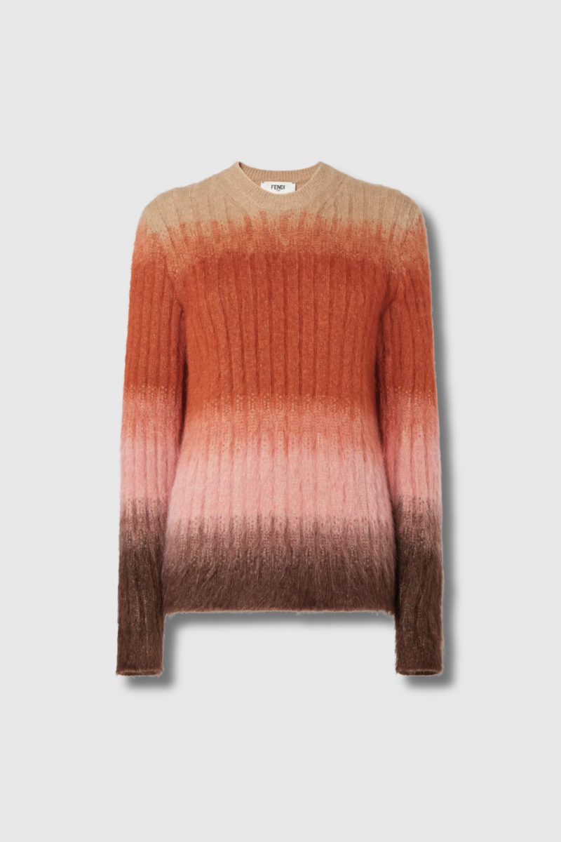 This round-neck, long-sleeved sweater by Fendi stands out with its ribbed vanisé knit crafted from a luxurious blend of mohair and wool, featuring a refined gradient of pink and brown hues. The fitted silhouette enhances the body’s natural lines, while the contrasting “Fendi Roma” embroidery on the front adds a signature touch. A soft, elegant piece that perfectly embodies Italian craftsmanship and Fendi’s modern aesthetic.