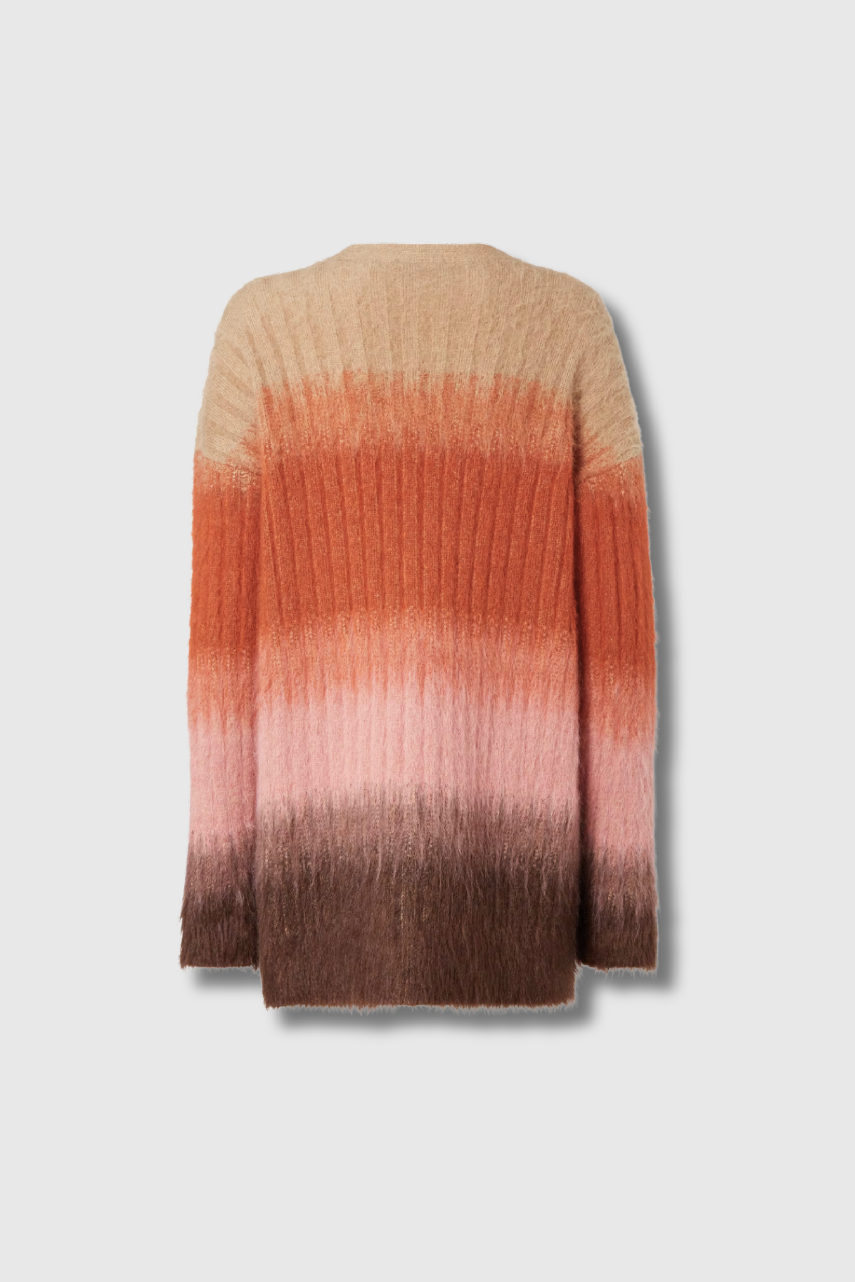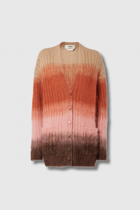 This Fendi mohair and wool cardigan combines Italian craftsmanship with contemporary elegance. Made from a luxurious blend of mohair, polyamide and wool, it features a subtle multicolour gradient inspired by Fendi’s archives. The oversized cut and V-neckline create a relaxed yet sophisticated silhouette, completed with front buttons and patch pockets for added refinement. Perfect for transitional seasons, it can be styled over denim or layered under a coat for a polished, effortless look.