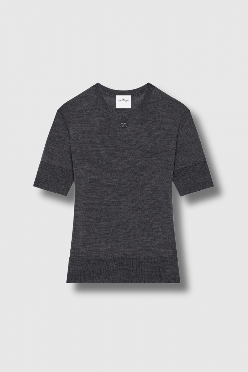 This Courrèges anthracite grey t-shirt reflects the iconic minimalist aesthetic of the Parisian house. Crafted from fine, structured knit, it features a fitted silhouette, clean short sleeves and a refined crew neckline. The subtle Courrèges logo embroidered on the front adds a sophisticated signature touch. A timeless essential for a modern, elevated wardrobe.