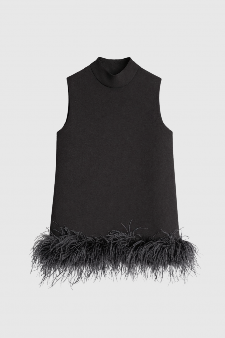 This Max Mara sleeveless top stands out with its clean silhouette and refined feather-trim hem. Crafted from a fluid yet structured fabric, it features a high neckline that enhances its modern, minimalist appeal. The delicate black feathers add movement and a subtle statement, making this piece ideal for elevated evening looks or sophisticated day-to-night styling.