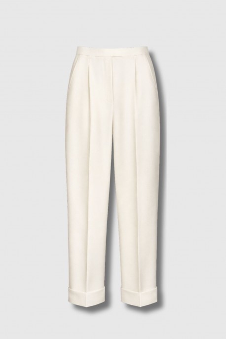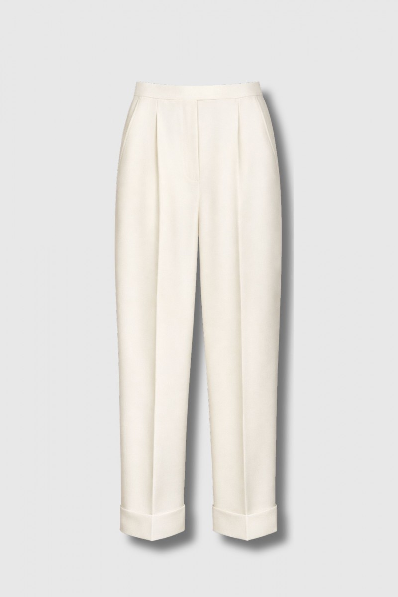 These wool trousers by Max Mara embody timeless, structured elegance. Crafted from fine wool, they feature a subtly wide straight cut enhanced by sharp pleats and cuffed hems for a refined tailoring finish. The luminous ivory shade brightens the silhouette and fits seamlessly into a chic, minimalist wardrobe. A sophisticated essential designed for both office wear and elevated occasions.