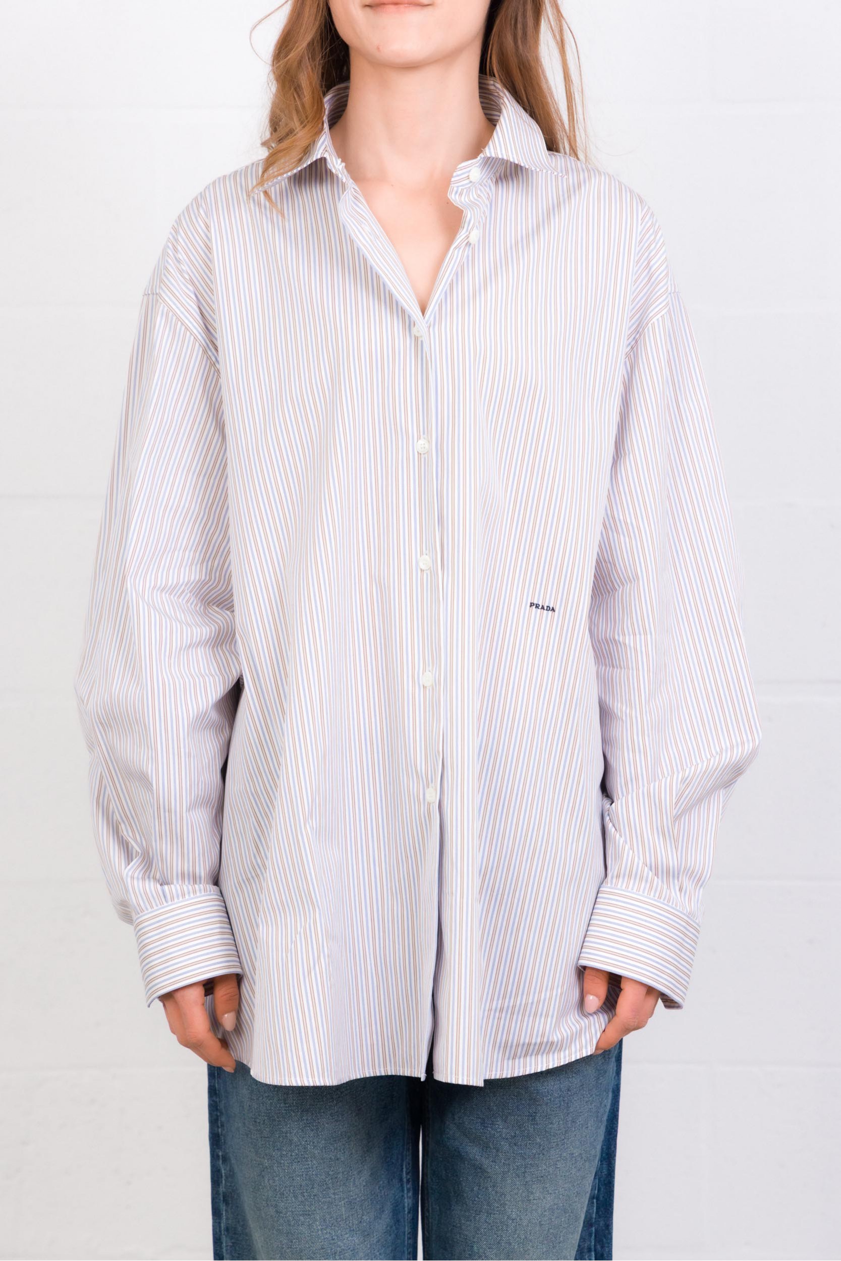 Prada striped button-down shirt, combining classic elegance with a contemporary attitude. Crafted from a lightweight, structured fabric, it features vertical blue, tobacco and white stripes that visually elongate the silhouette. Designed with a classic collar and clean button placket, it has a slightly oversized fit for a fluid drape. Ideal for a casual-chic look or styled under a blazer for a more refined silhouette, this versatile piece adds understated modernity to the women’s wardrobe.