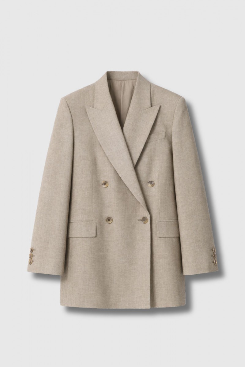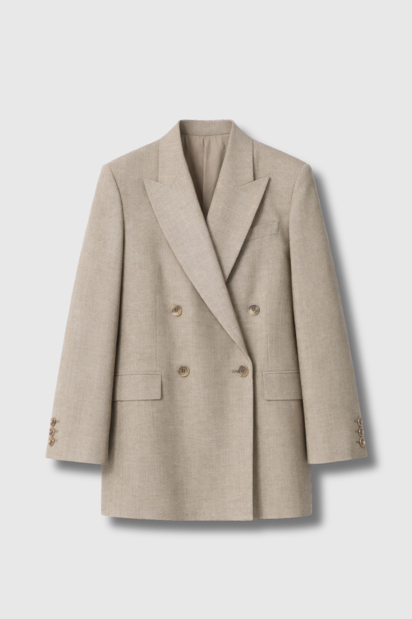 Wide tailored lapels and flap pockets add a timeless, refined touch, while the soft beige shade makes it easy to style. Button details at the cuffs highlight its Italian sartorial influence.