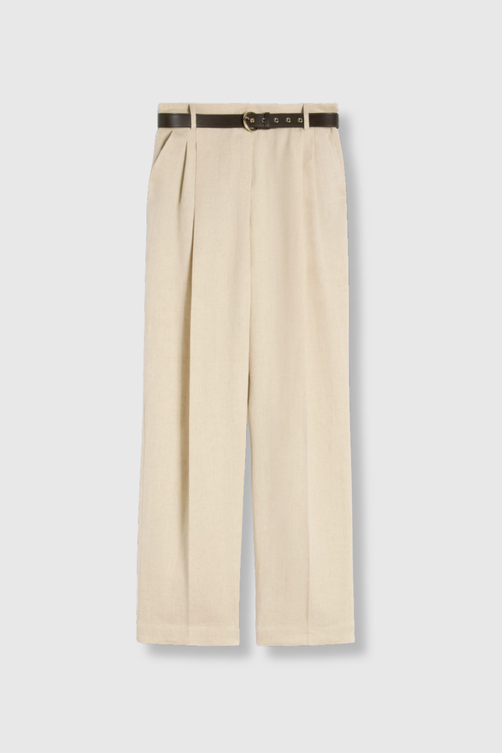 The Sumero trousers by Max Mara are crafted from 100% linen, offering a naturally lightweight and breathable feel. Their fluid straight cut and structured waistband ensure a clean, elegant drape, while the colonial beige shade adds timeless sophistication. Subtle front pleats and the belt detail enhance the refined tailoring aesthetic, perfect for a chic summer wardrobe.