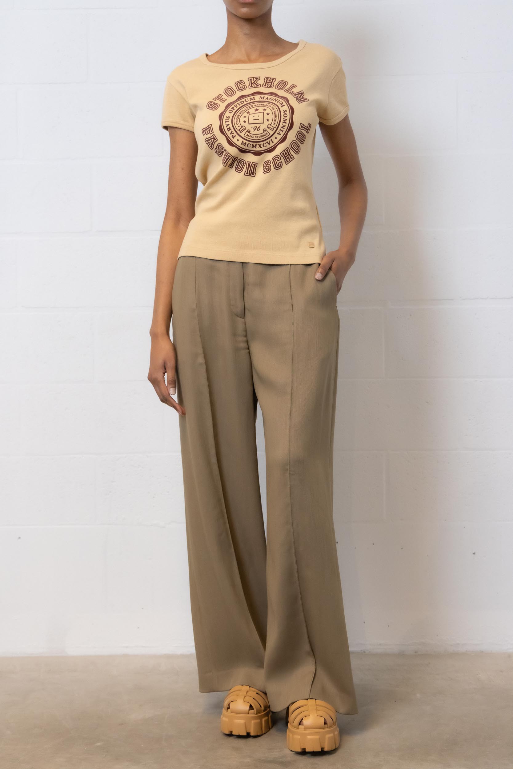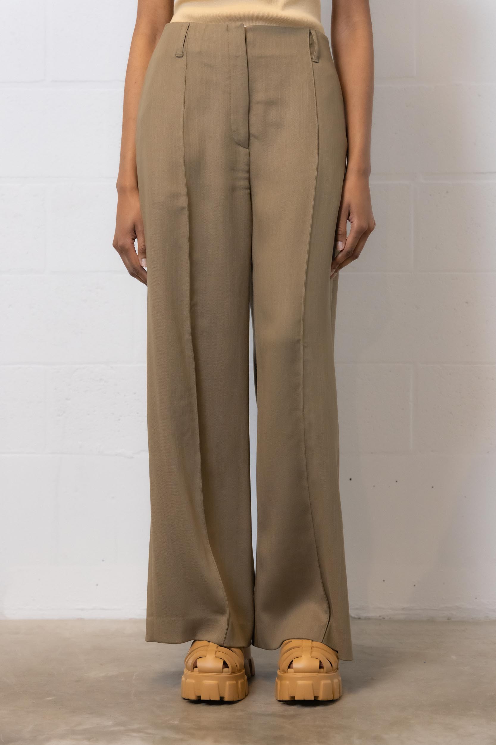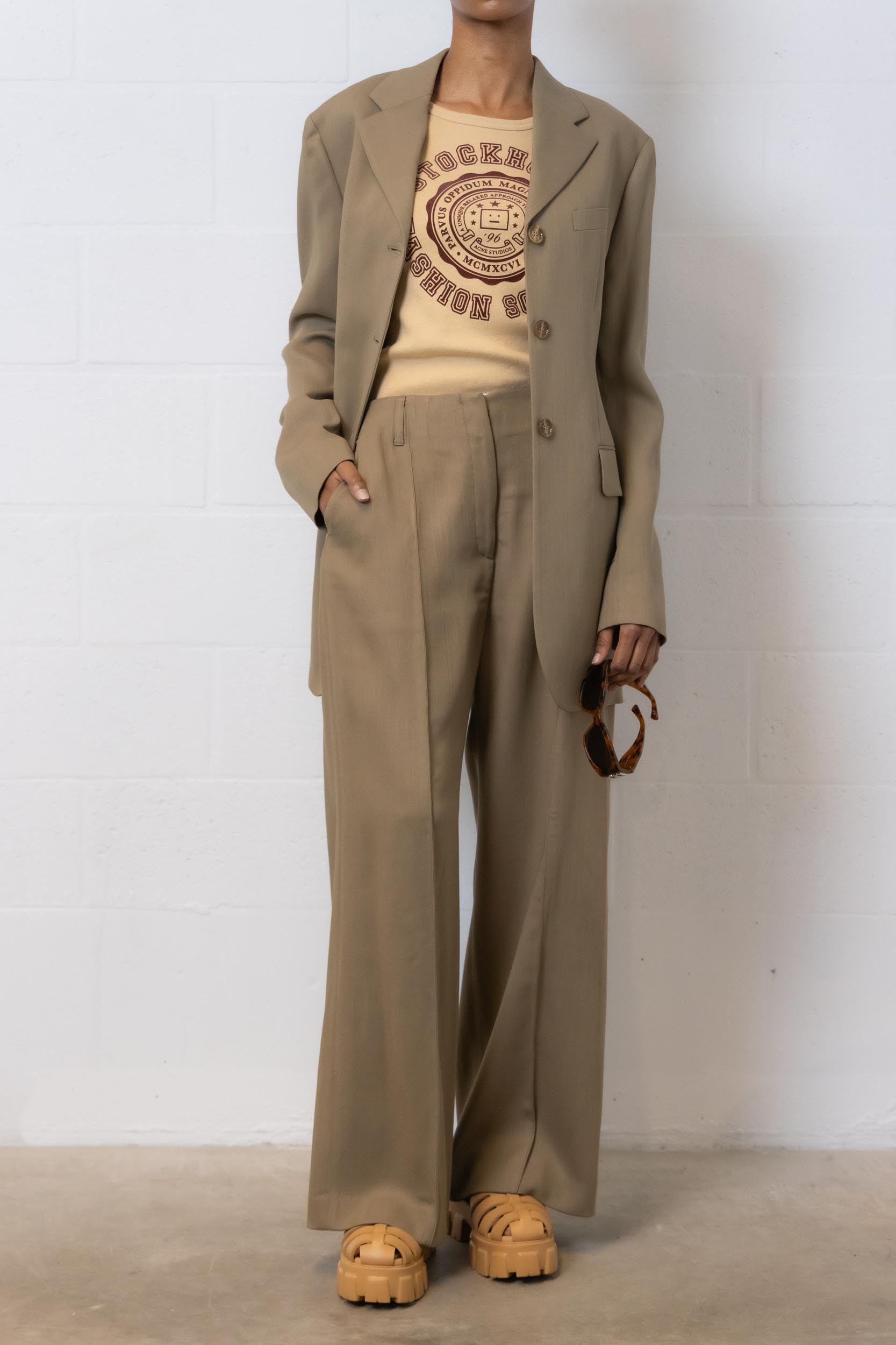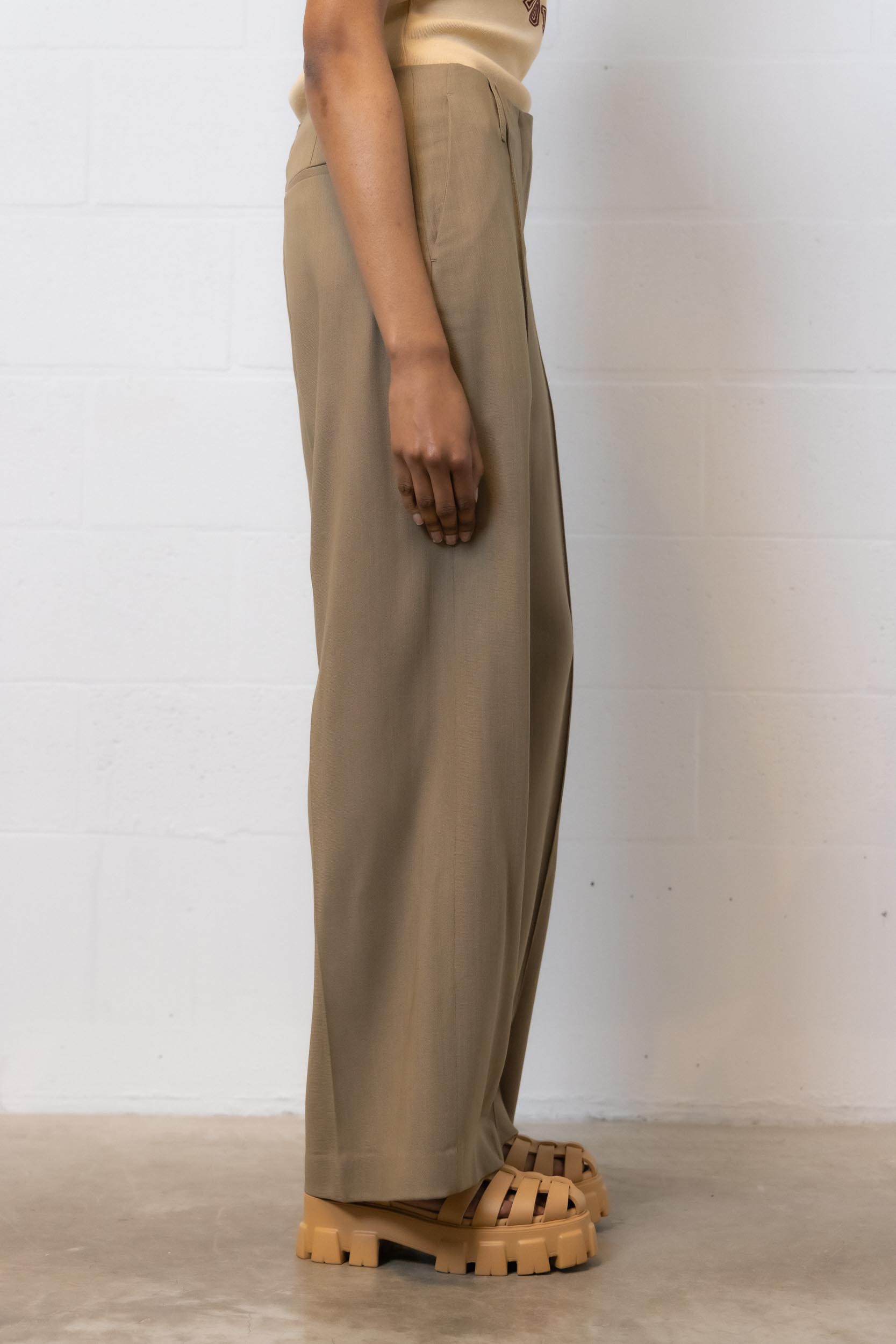 These beige wool "MUD BEIGE" tailored pants are desgined by Acne Studios. Made from a wool blend, they feature a loose, light, flowing cut. These wide-leg pants have a mid-rise waistband and are pleated at the front.