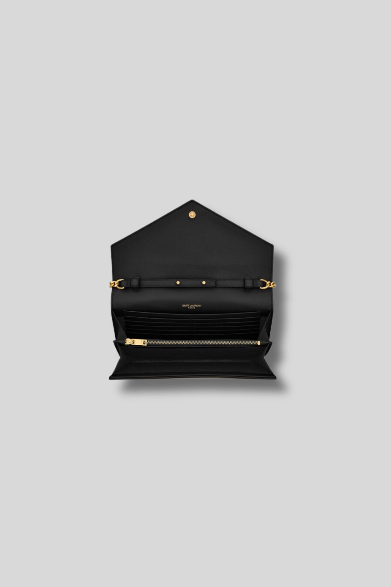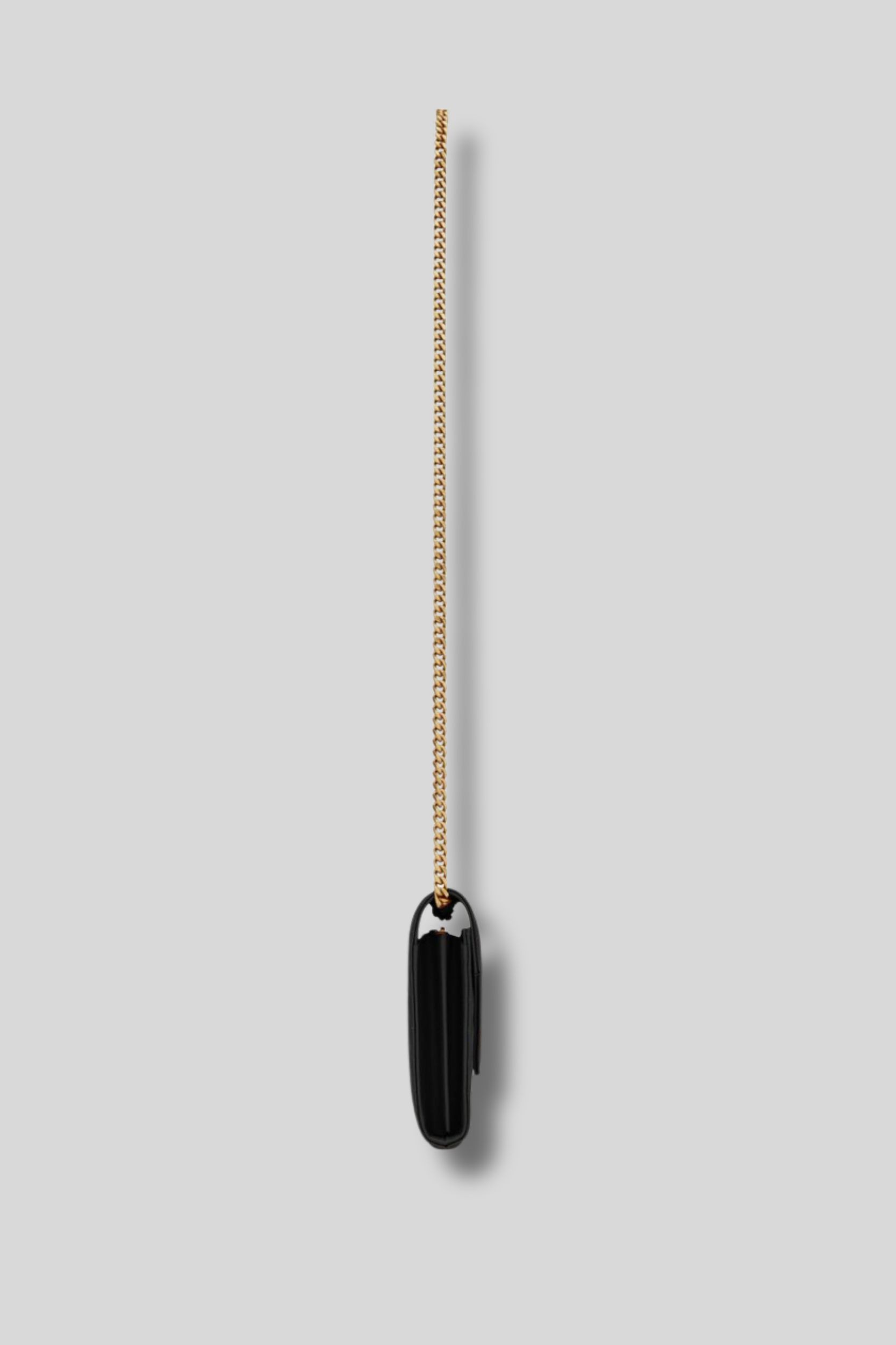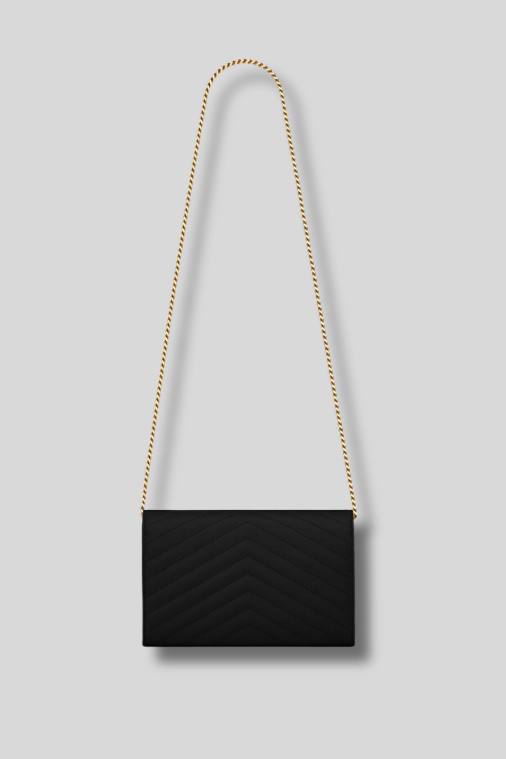 This black grained leather clutch bag is signed Saint Laurent. It has a Cassandre logo and a removable gold chain allowing it to be worn by hand or on the shoulder.