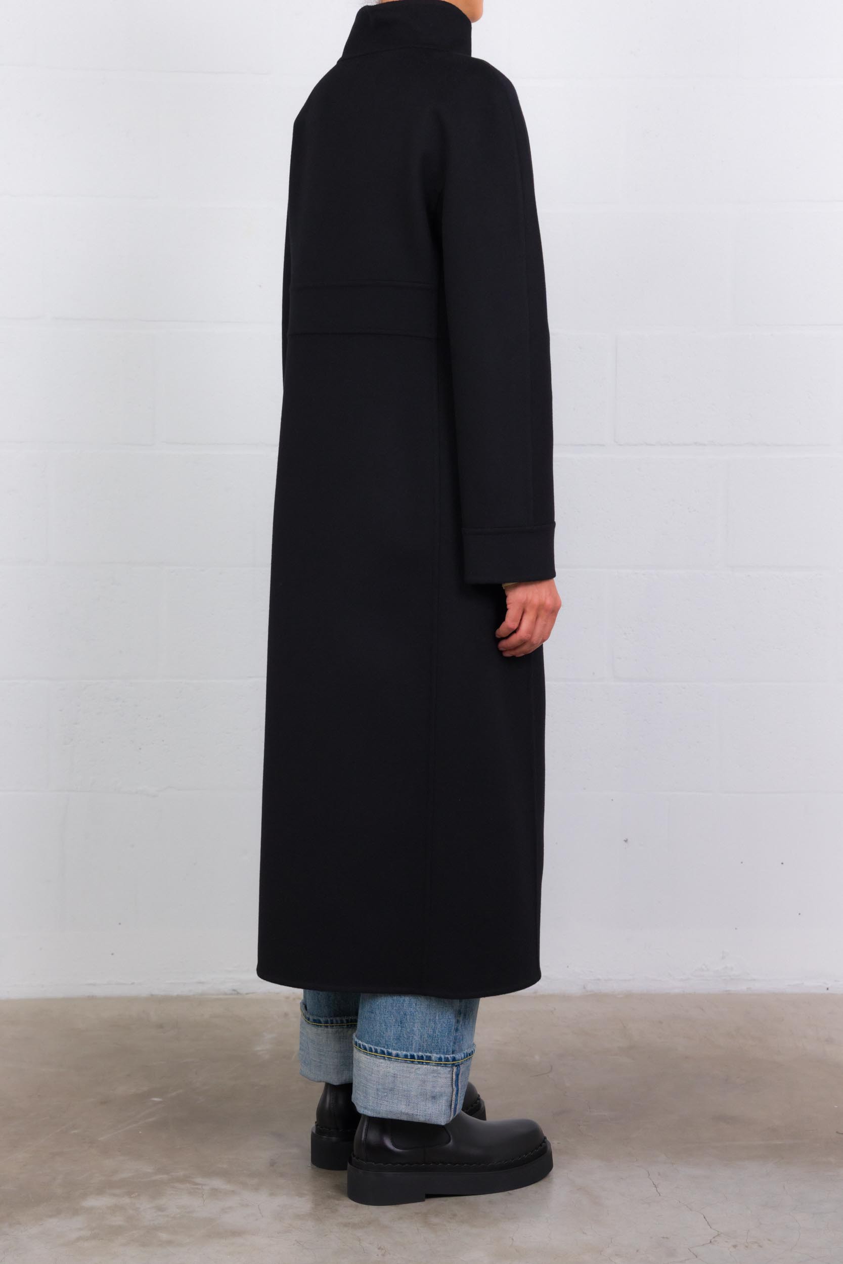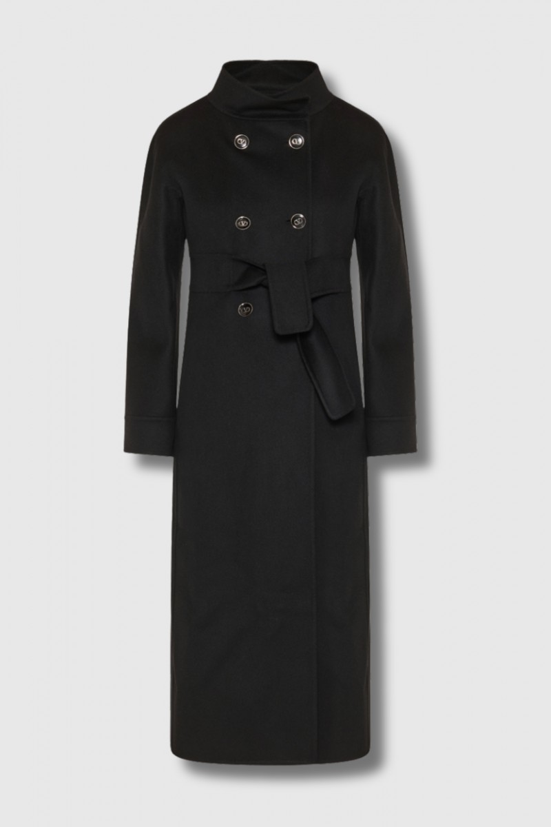 This black coat in compact wool by Valentino Garavani captivates with its timeless elegance. Featuring a stand-up collar and a double-breasted crossover closure, it comes with a belt to accentuate the waist. Its straight cut gives it a structured yet feminine look.