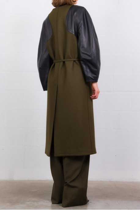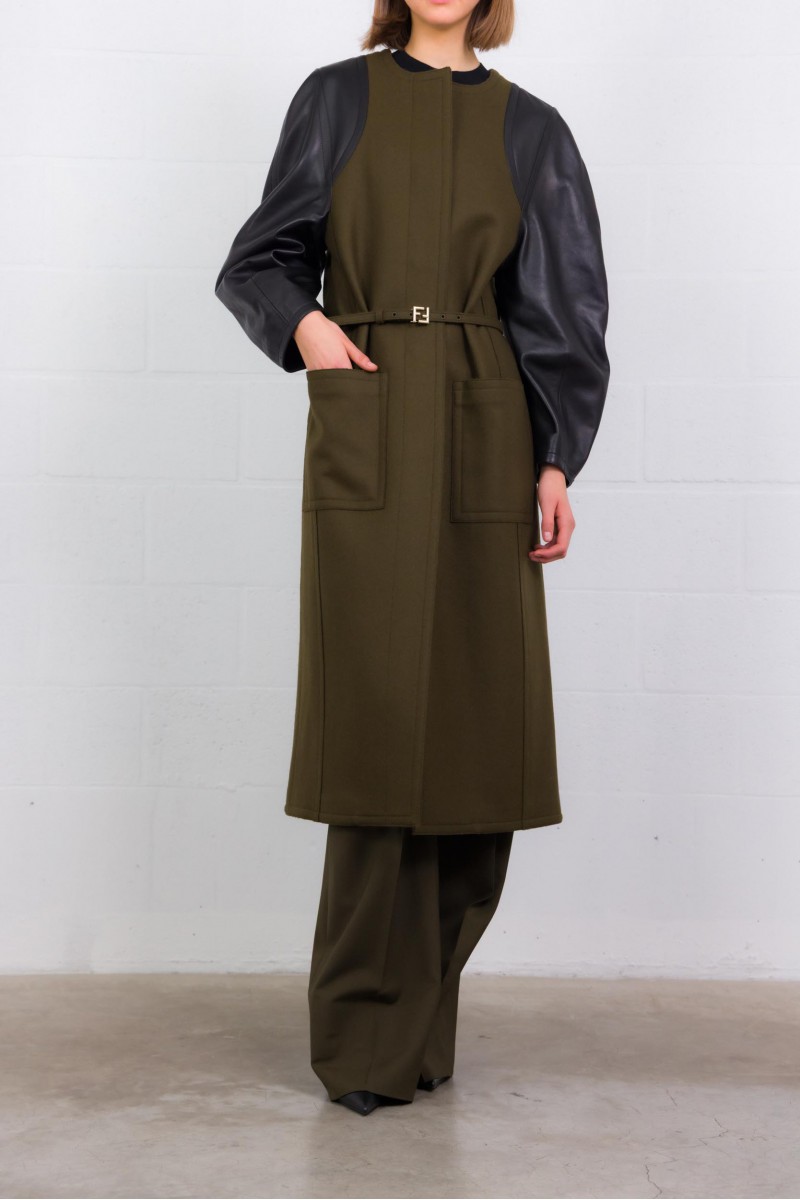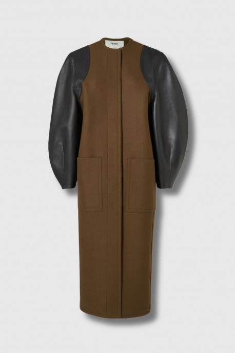 This Fendi wool and leather coat combines timeless elegance with contemporary design. Crafted from olive green wool felt, it stands out for its mid-length cocoon cut with a refined round neck and wide, flowing sleeves. The soft nappa leather sleeves and patch pockets add a sophisticated touch of contrast. Its concealed fastening emphasises a sleek, modern silhouette, faithful to the iconic style of the House of Fendi.