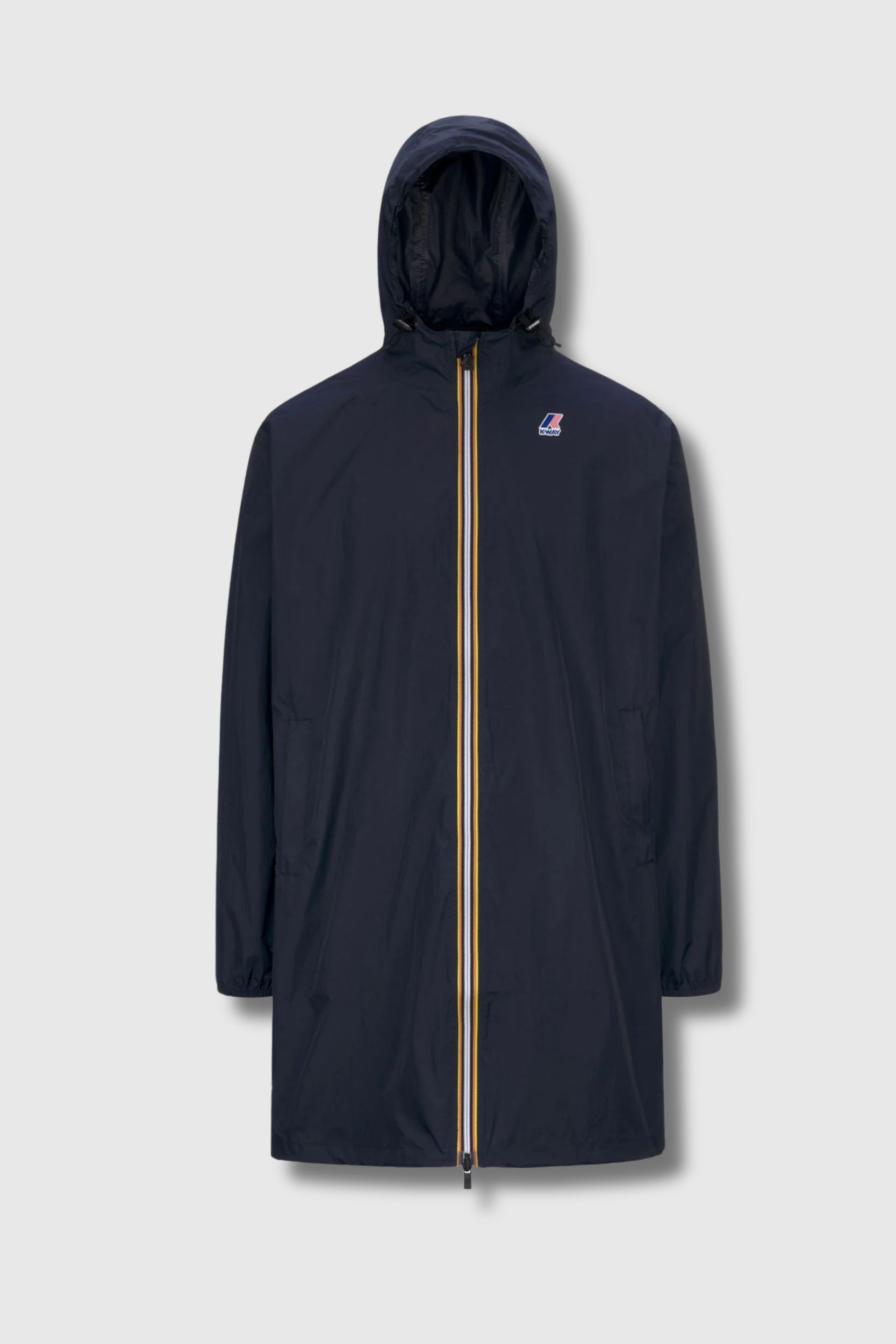 The Le Vrai Eiffel 4.0 East navy rain jacket by K-Way is a long unisex style combining performance and practicality. Made from 100% recycled micro ripstop 4.0 fabric, it provides 10K waterproofing and 10K breathability, with heat-sealed seams ensuring excellent protection against wind and rain. Its comfortable, relaxed fit allows ease of movement. Lightweight and compact, it folds into one of its pockets, making it perfect to carry in a bag or backpack for sudden weather changes.