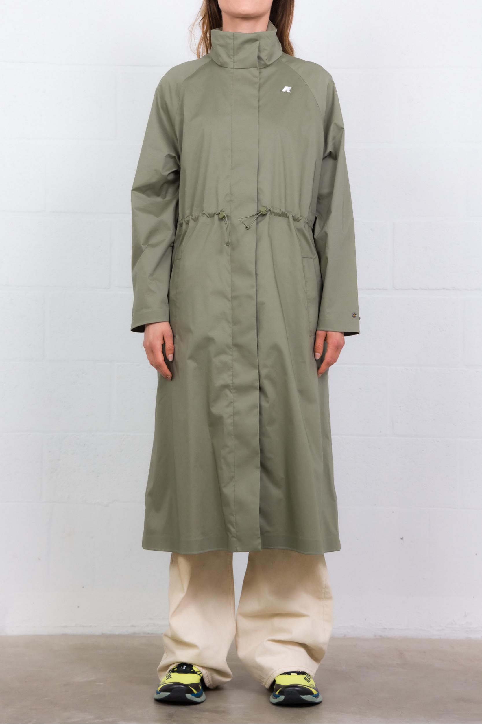 The Barbrein kaki long waterproof trench by K-Way is a women’s coat designed for transitional seasons, combining technical performance with everyday comfort. Its 3-layer construction features a rain-resistant cotton-blend outer layer with a natural texture, an insulating inner membrane, and a soft micro-jersey lining. Reflective heat-taped seams enhance weather protection, while adjustable cuffs add functional detail. A refined yet practical piece for daily wear.